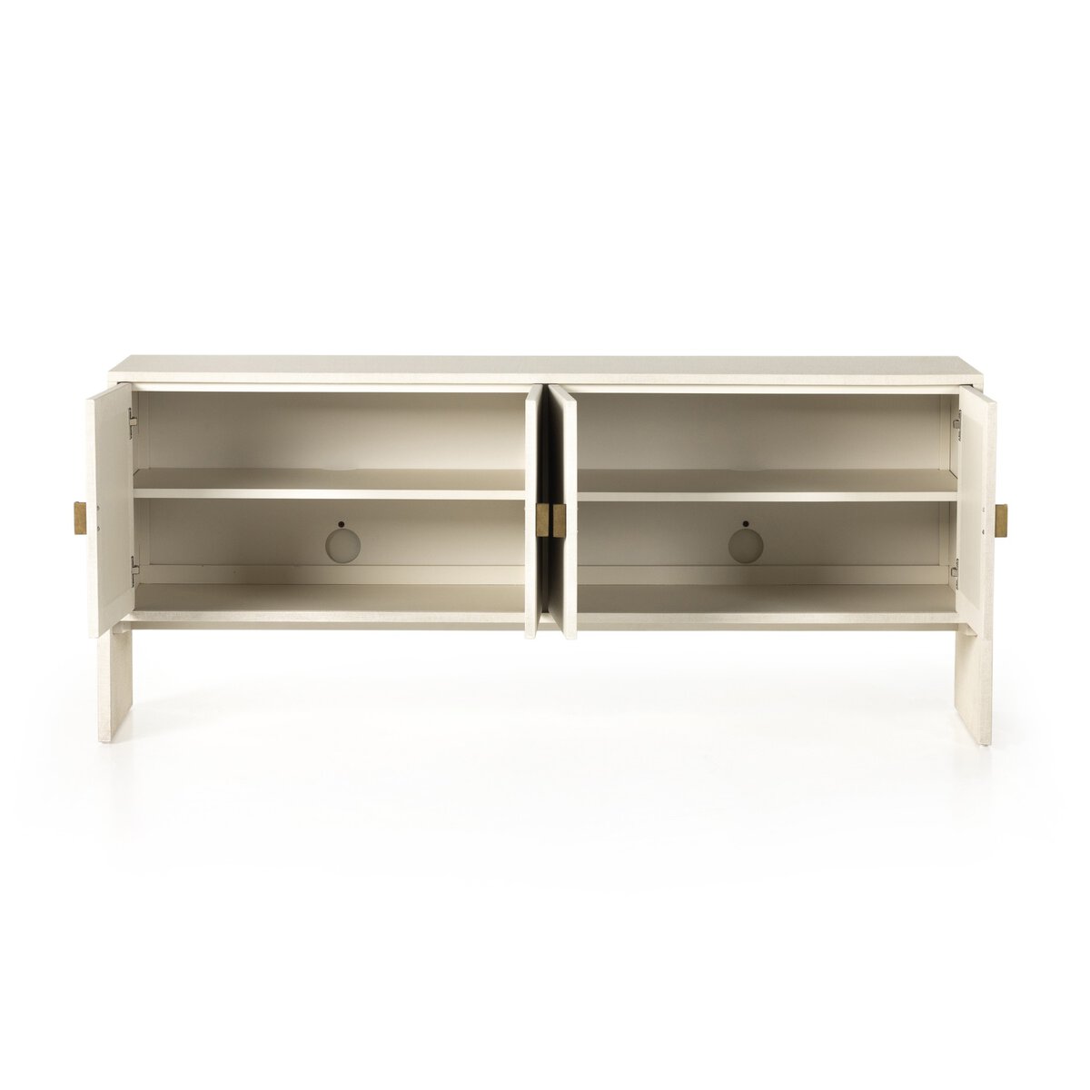 Habla de novedad. Hechas de lino pintadas en un marfil claro, las patas arqueadas suavizan la forma limpia y moderna. Con un acabado de latón antiguo, los herrajes de hierro en forma de media luna completan el look. Aberturas traseras dobles para la gestión de los cables.
