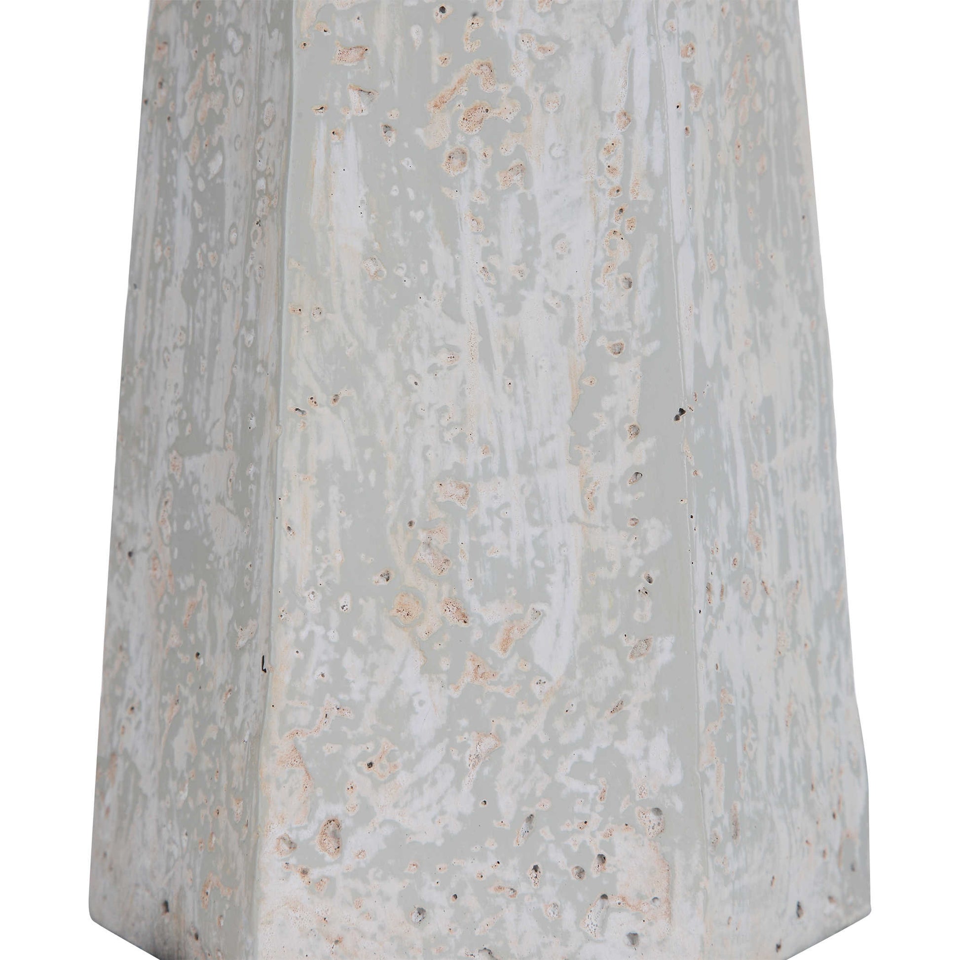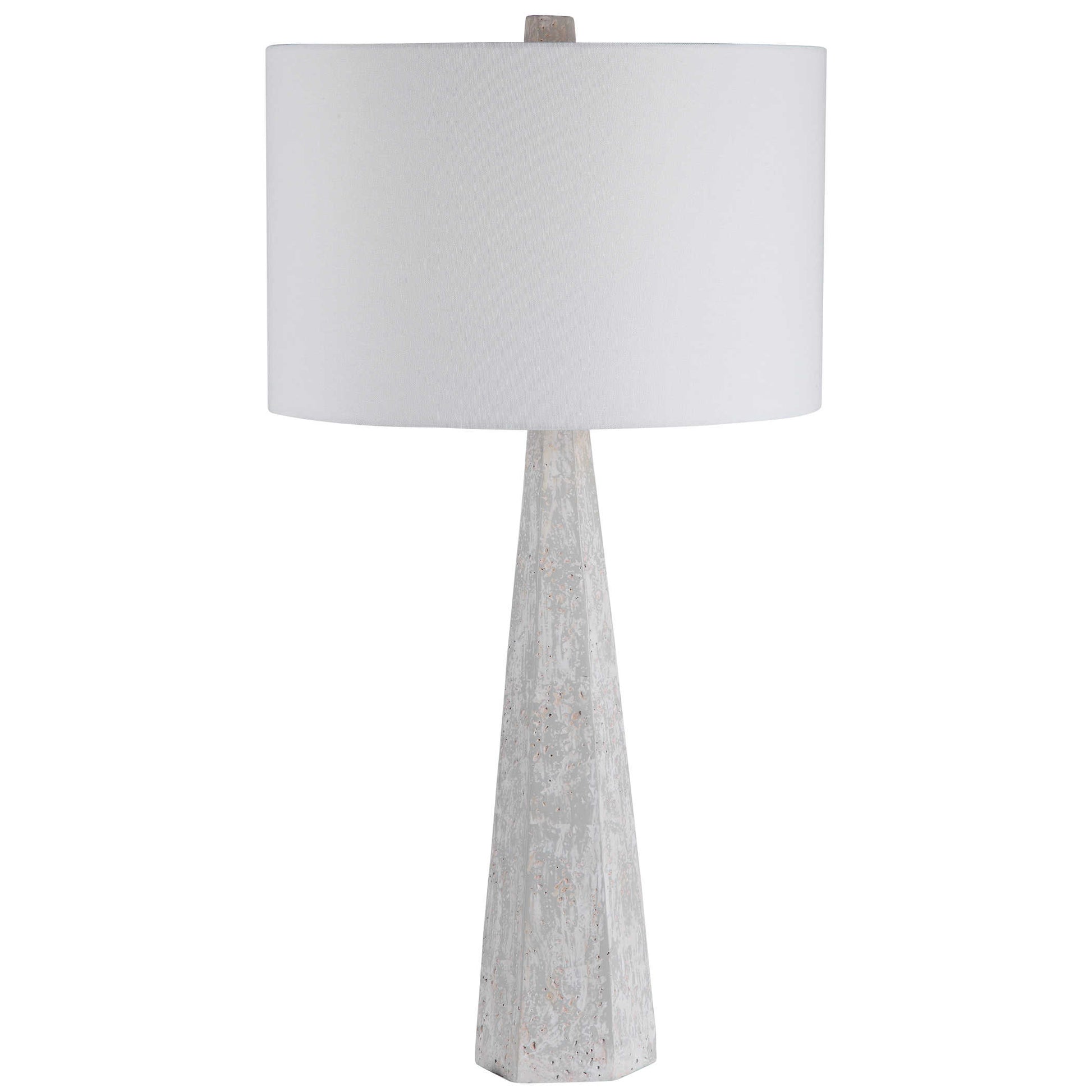 Esta lámpara de mesa muestra una base cónica en un aspecto de hormigón con bordes nítidos y textura porosa rematada en tonos blanco, gris claro y topo, combinados con detalles de níquel cepillado. El tono redondo del tambor tapa dura es un tejido de lino blanco.