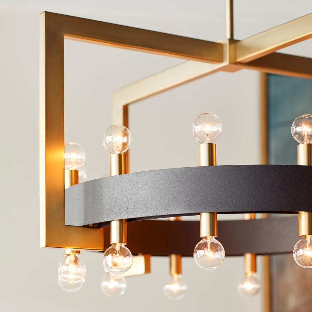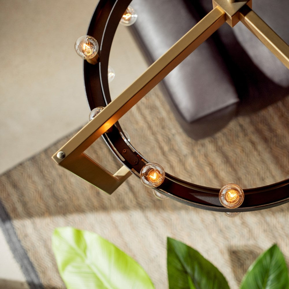 La lámpara de araña Medieval Hammer es un accesorio de iluminación sumamente imponente. Su magnífica estructura geométrica y su marco están dorados y revestidos con un lujoso monocromo oscuro. El marco circular de la araña alberga varios accesorios de iluminación para realzar