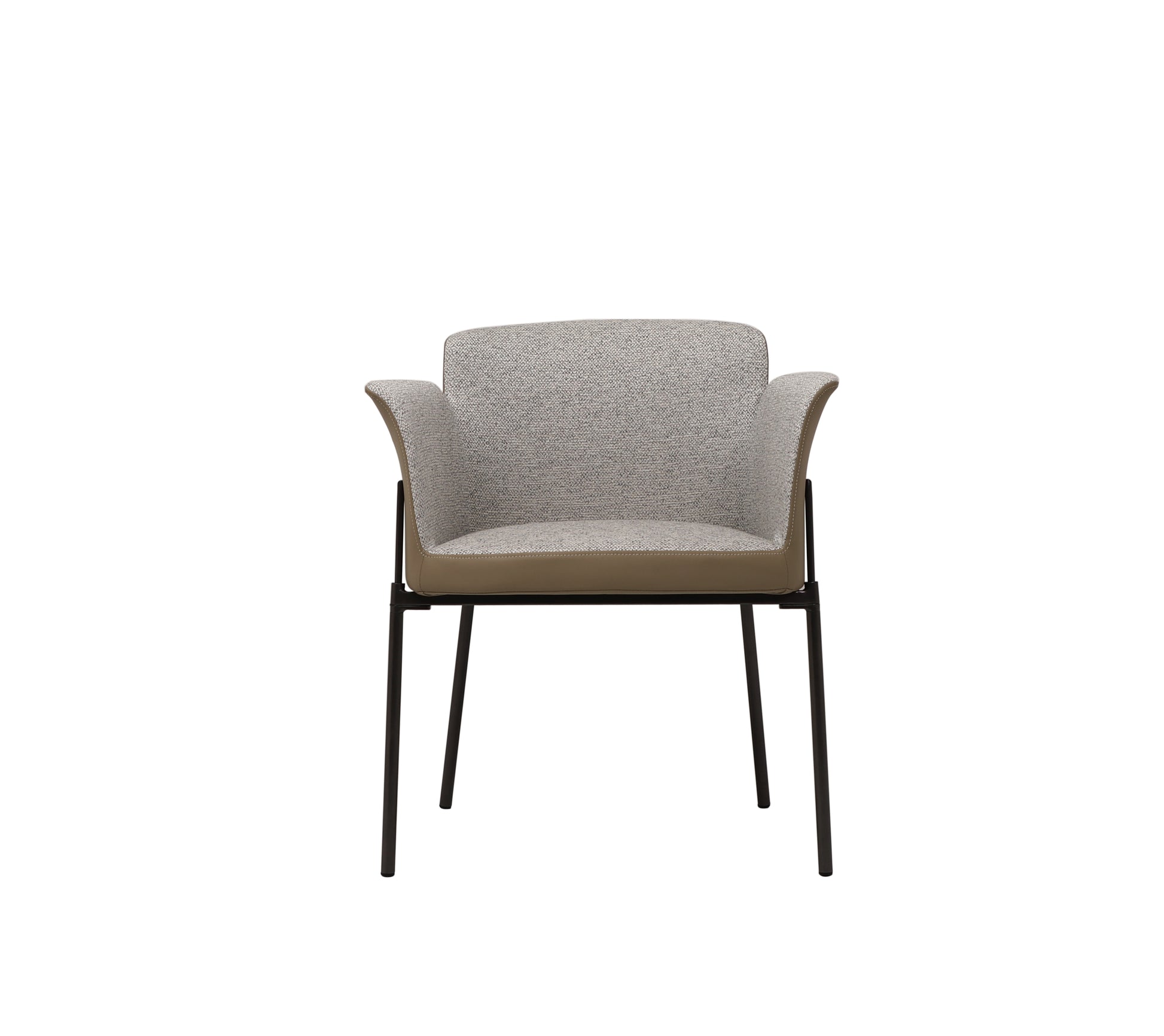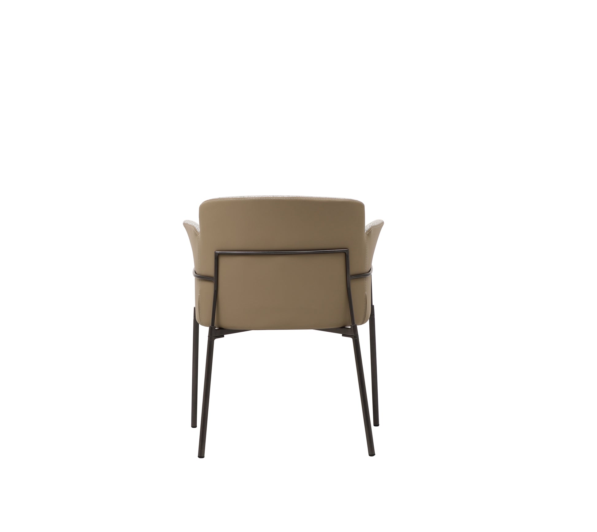 Esta silla presenta un diseño contemporáneo y acogedor, ideal para ambientes modernos. Su respaldo y reposabrazos están tapizados en una tela gris claro de textura suave, mientras que la parte exterior y el asiento están recubiertos en un material tipo piel color beige. La estructura metálica negra, con patas delgadas y detalles en los laterales, aporta estabilidad y un toque industrial sutil. Su combinación de materiales y formas proporciona comodidad y estilo, perfecta para oficinas, salas de juntas o comedores elegantes.