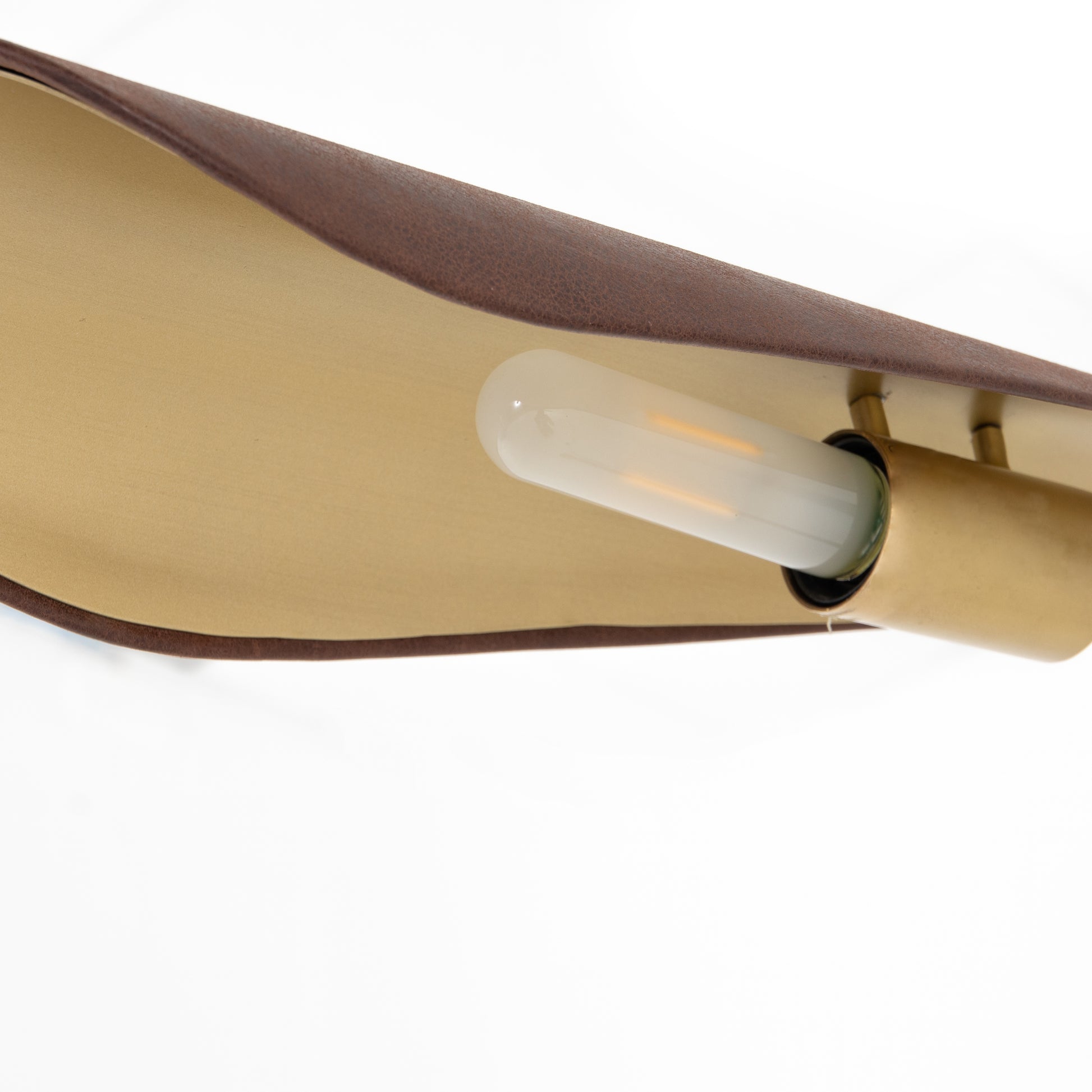 Con estilo. Con el tamaño perfecto para colocarla sobre el brazo de su sofá o sillón favorito, su base de chapa de nogal soporta tubos de acero con acabado en latón y una pantalla de cuero marrón de grano superior con detalles de pasadores de latón, lo que le da una combinación de materiales vanguardista.