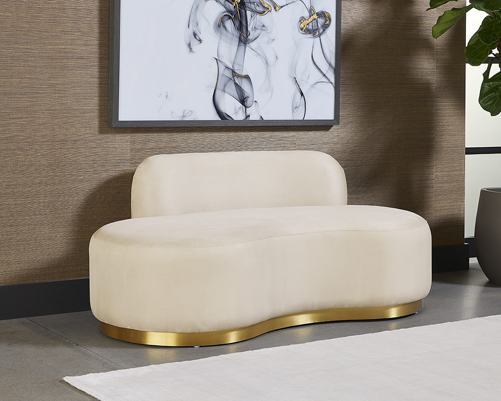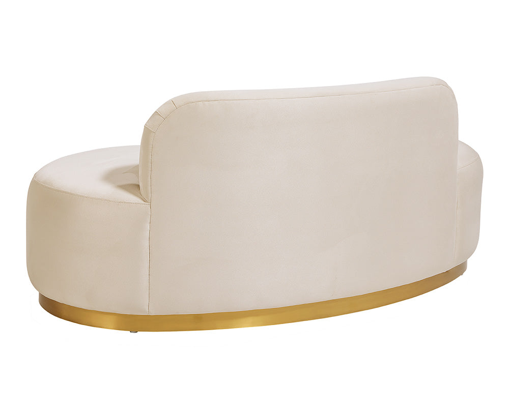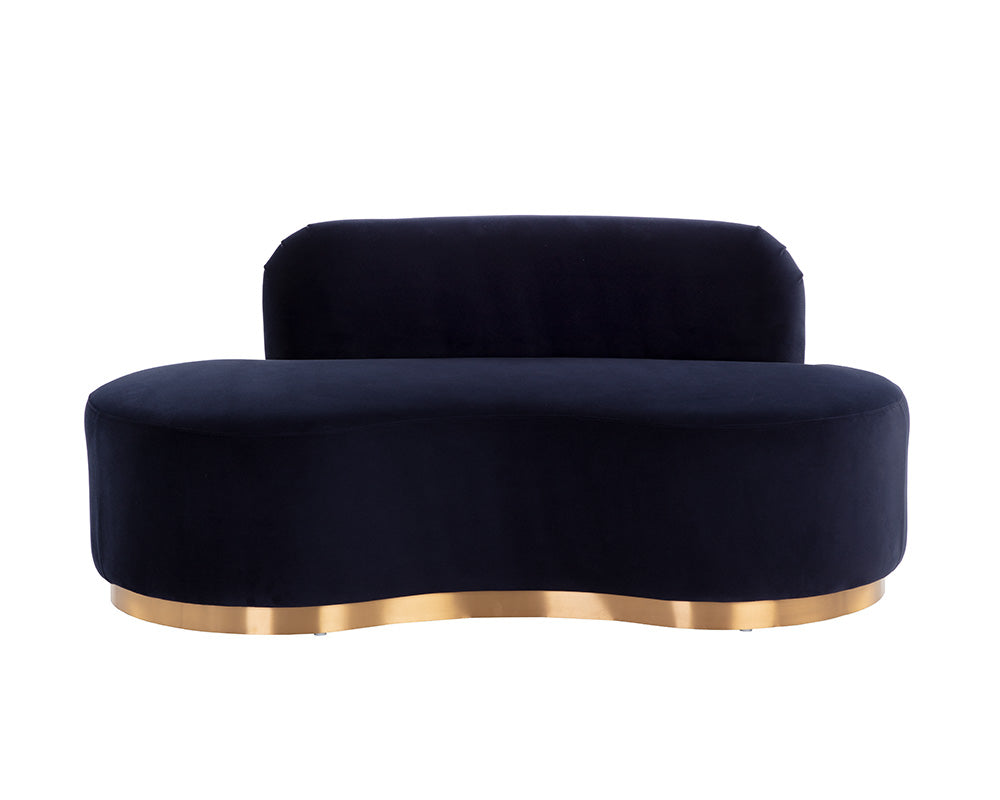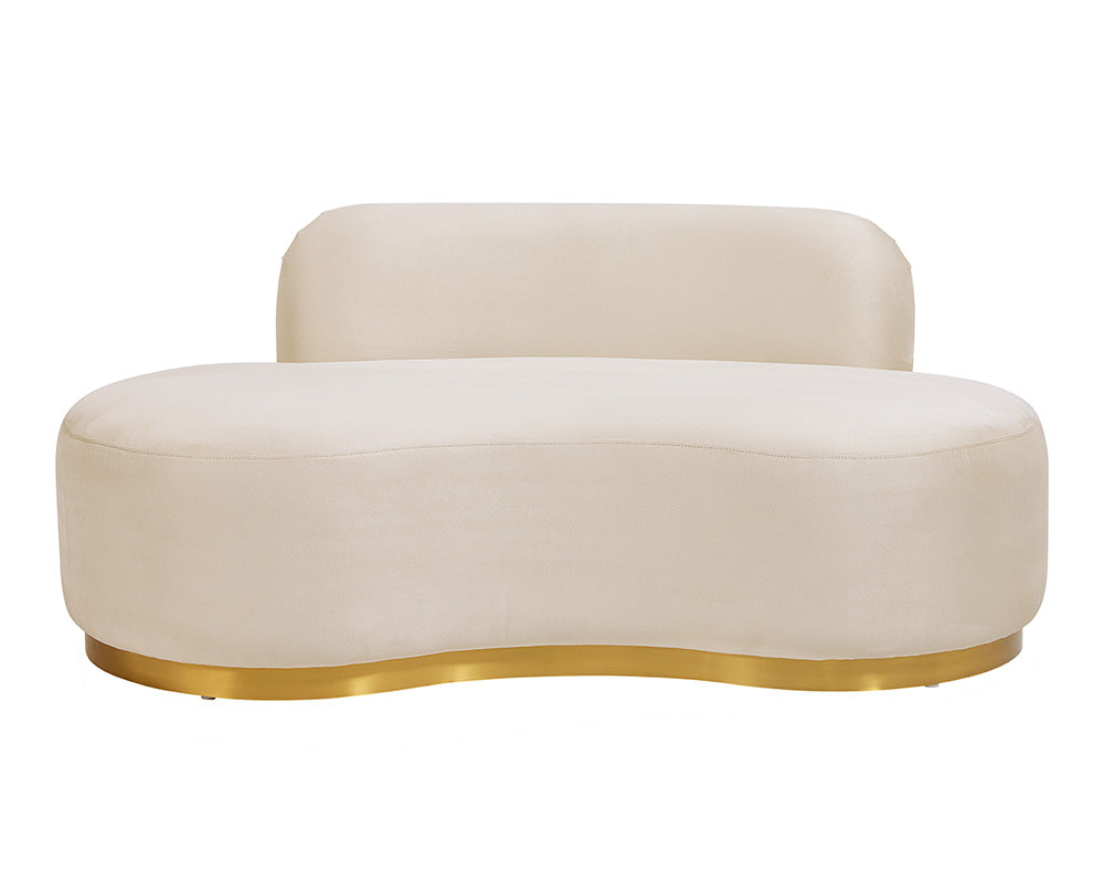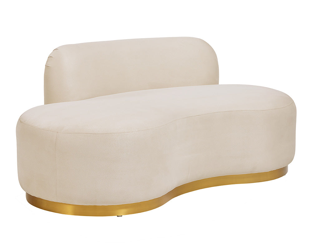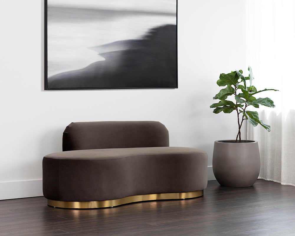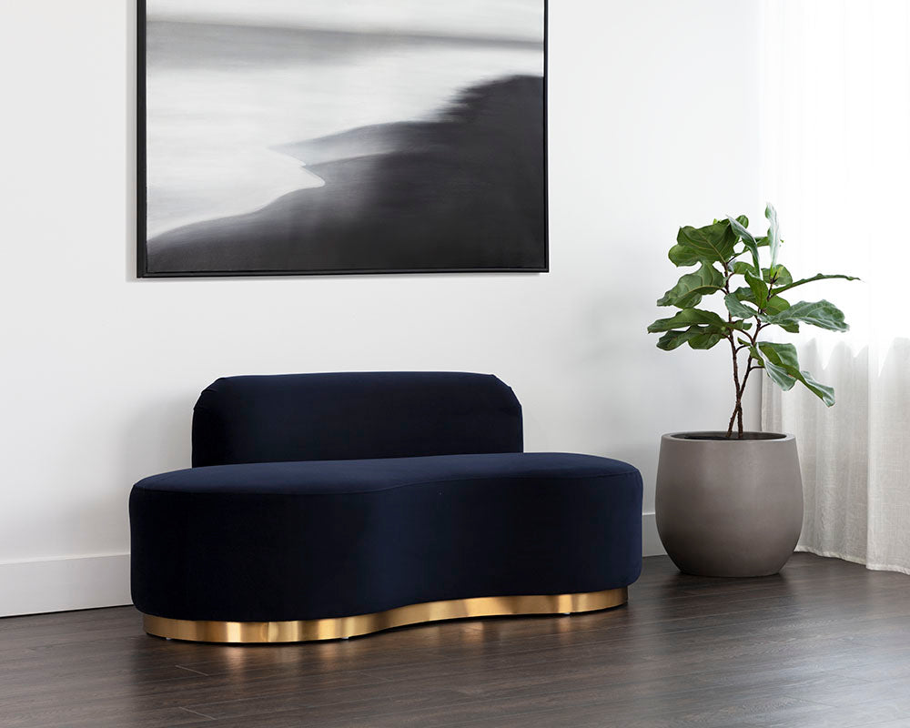 Con un impresionante diseño contemporáneo, este espléndido banco presenta una fascinante forma curva que agregará un atractivo impresionante a cualquier espacio. Surtido en tela de nube casablanca y completado con una base de acero inoxidable dorado. También disponible en telas mega ceniza e índigo.