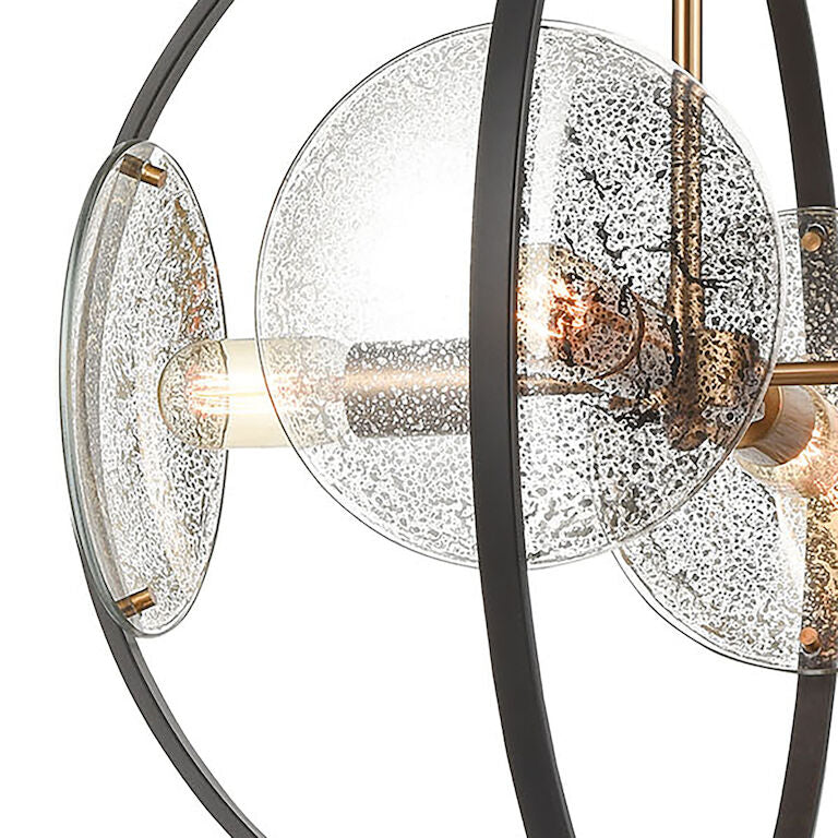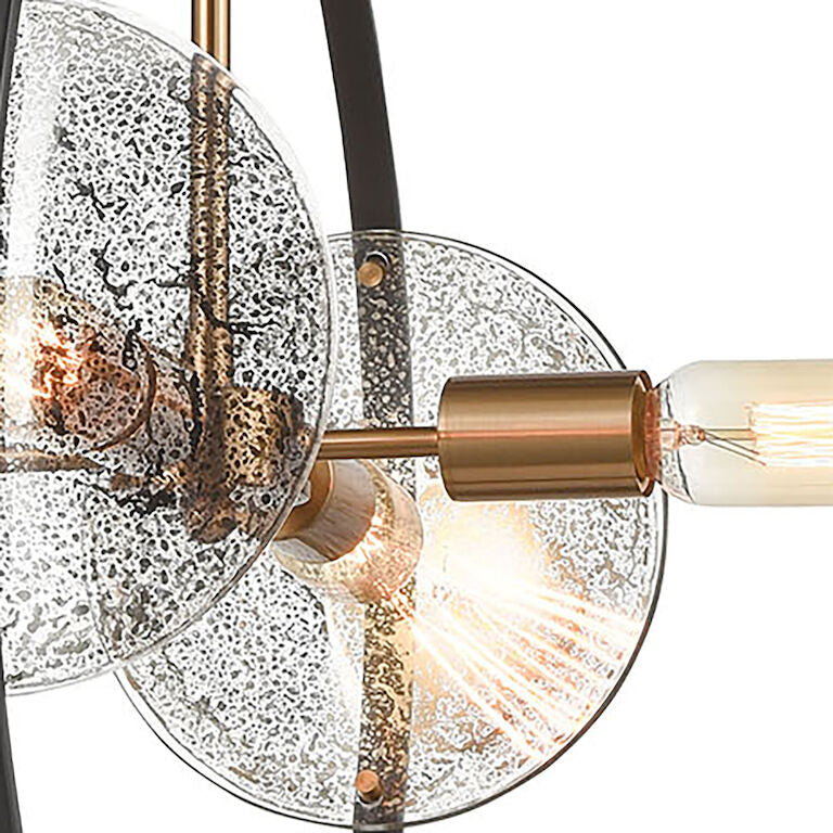 La colección Oriah presenta discos de vidrio de mercurio que se destacan individualmente por luces que sobresalen del núcleo central de la pieza. Acabado en negro mate con herrajes de latón satinado en el interior del marco.