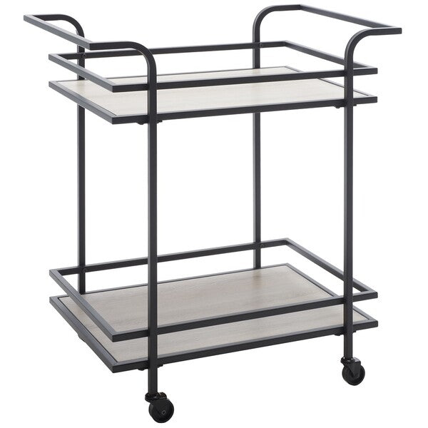 Nuestro carrito de bar de dos niveles presenta una silueta moderna y de líneas limpias para brindar elegancia refinada a cualquier rincón. Presenta un acabado negro mate y un enchapado gris para una apariencia versátil y encantadora. Nuestro elegante carrito de servicio integra manijas bellamente curvadas y rieles protectores para llegar fácilmente a cualquier rincón
