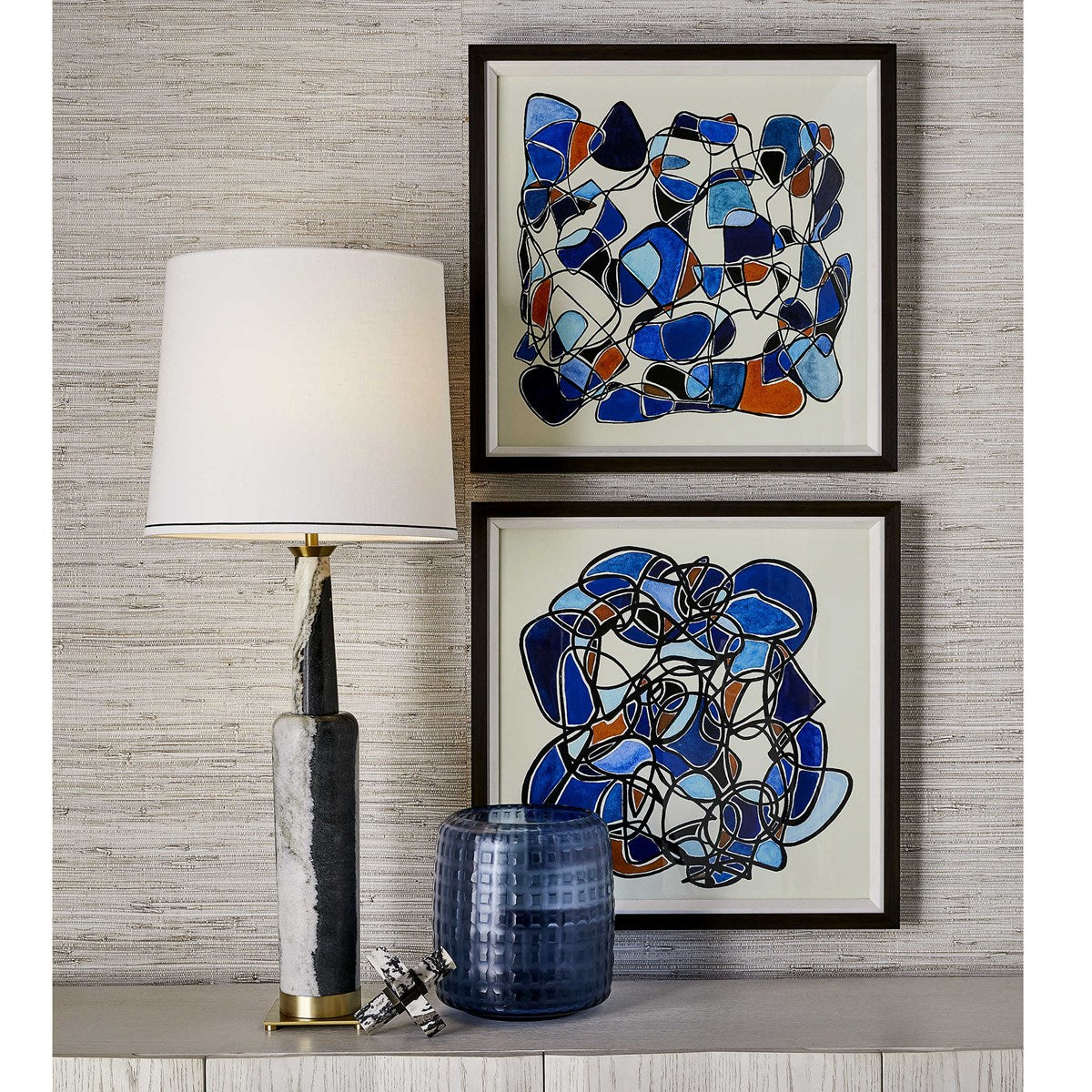 A primera vista, Congregation Set of 2 ofrece divertidos y brillantes toques de color en rojo y varios tonos de azul. Pero si se mira más a fondo, se pueden ver formas de personas congregadas. Ya sea que estén hablando, bailando o llegando a una fiesta, son un espectáculo bienvenido. Ilustración de Jenna Guthrie.