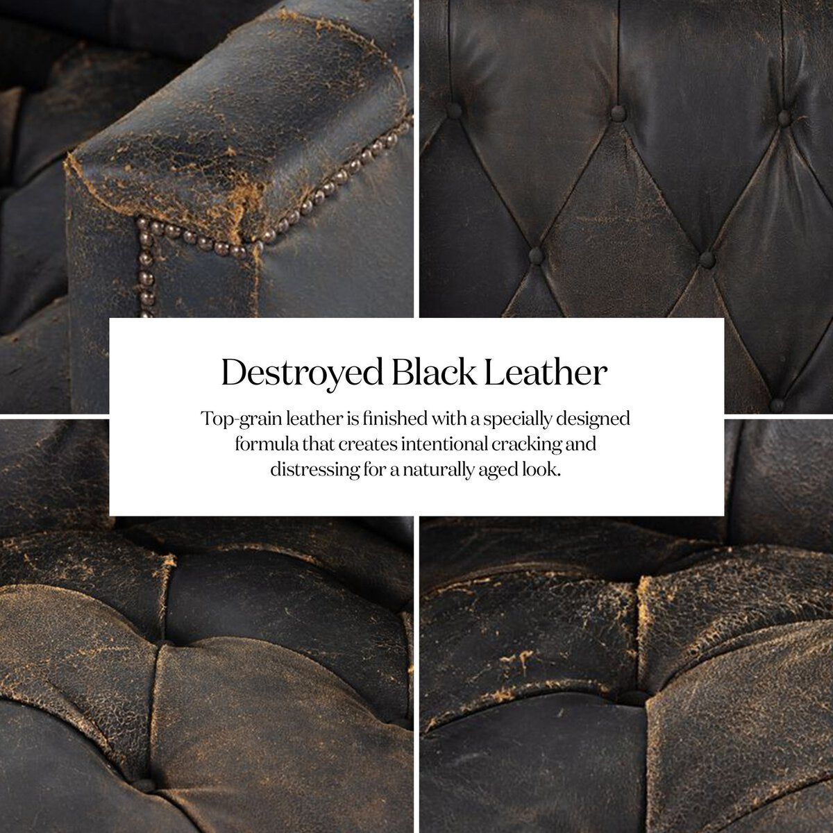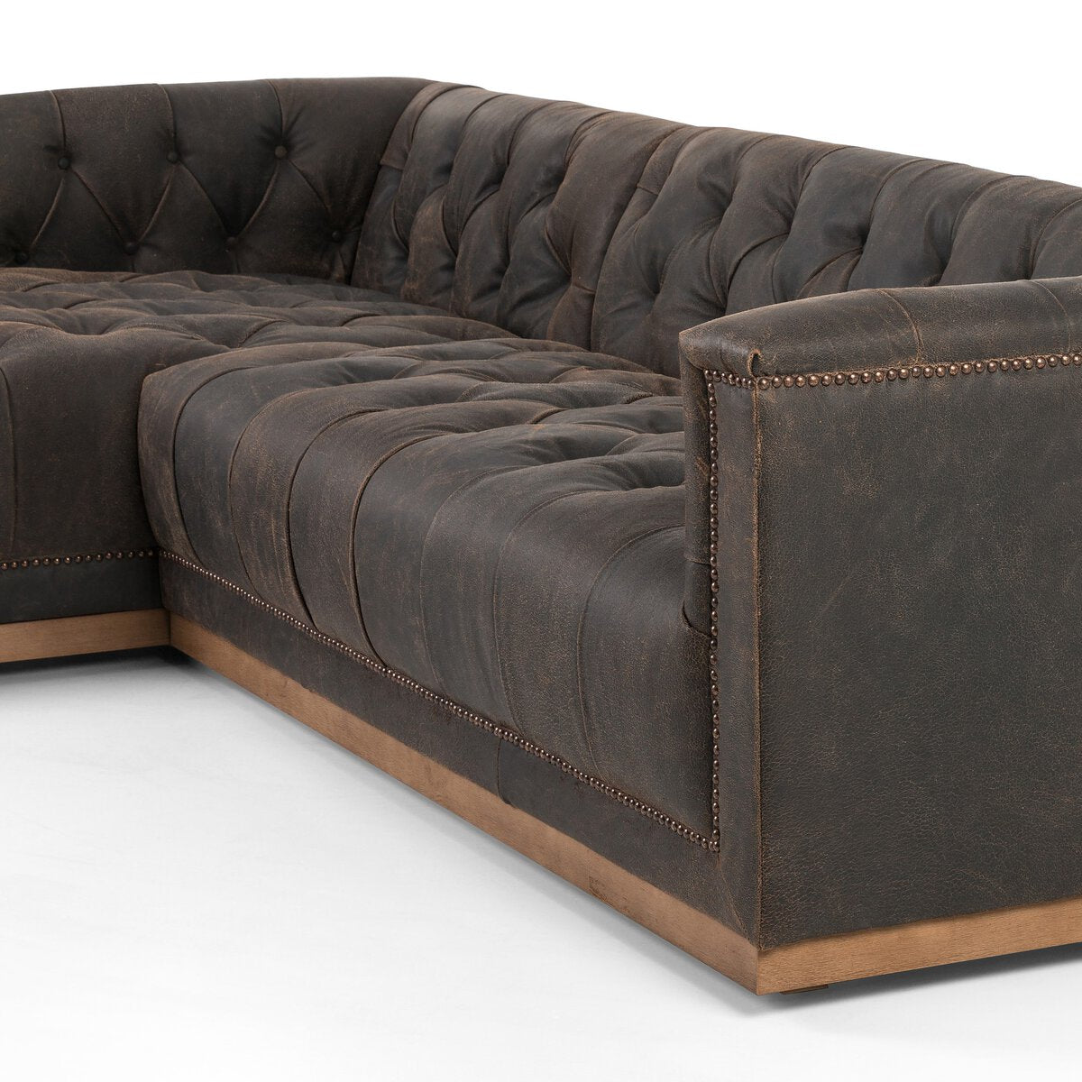 Una versión moderna del clásico sofá de biblioteca con la funcionalidad de un seccional. Tapizado en cuero negro de grano superior y acabado con una fórmula especial que crea grietas y desgastes intencionados para un aspecto envejecido natural. Montado sobre una base de roble envejecido y acabado con tachuelas de bronce envejecido.
