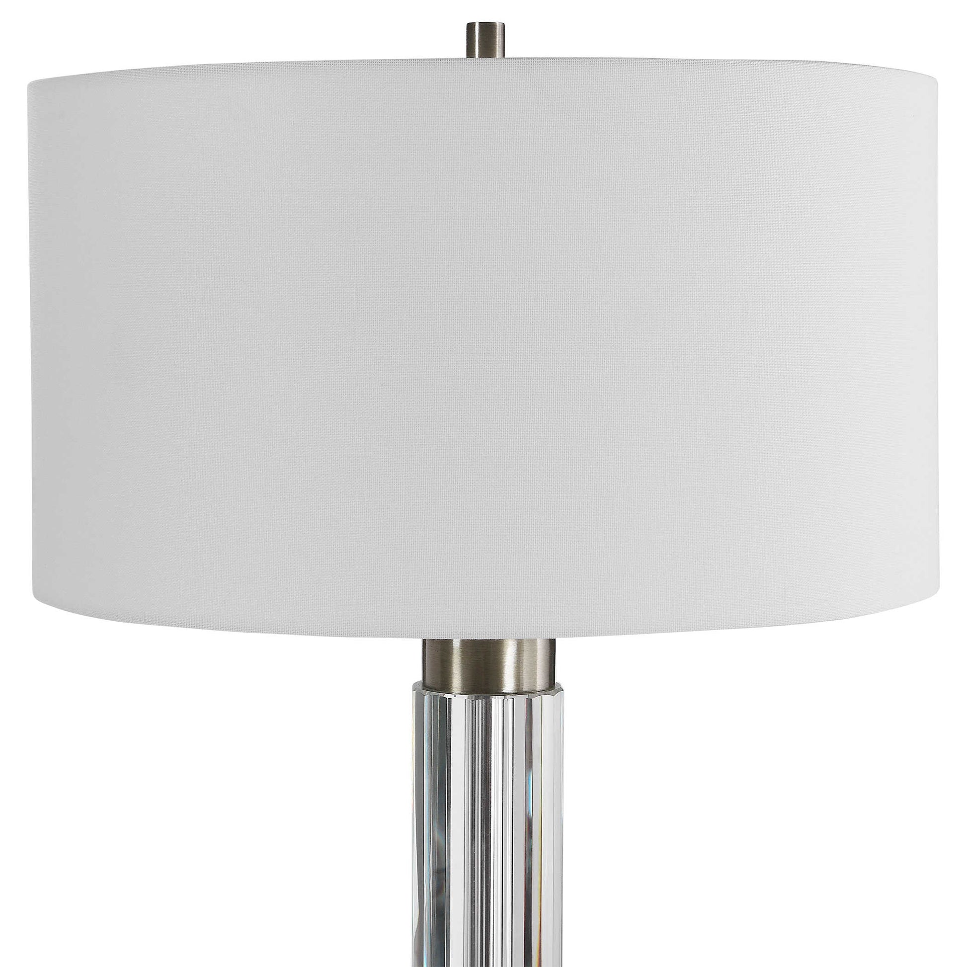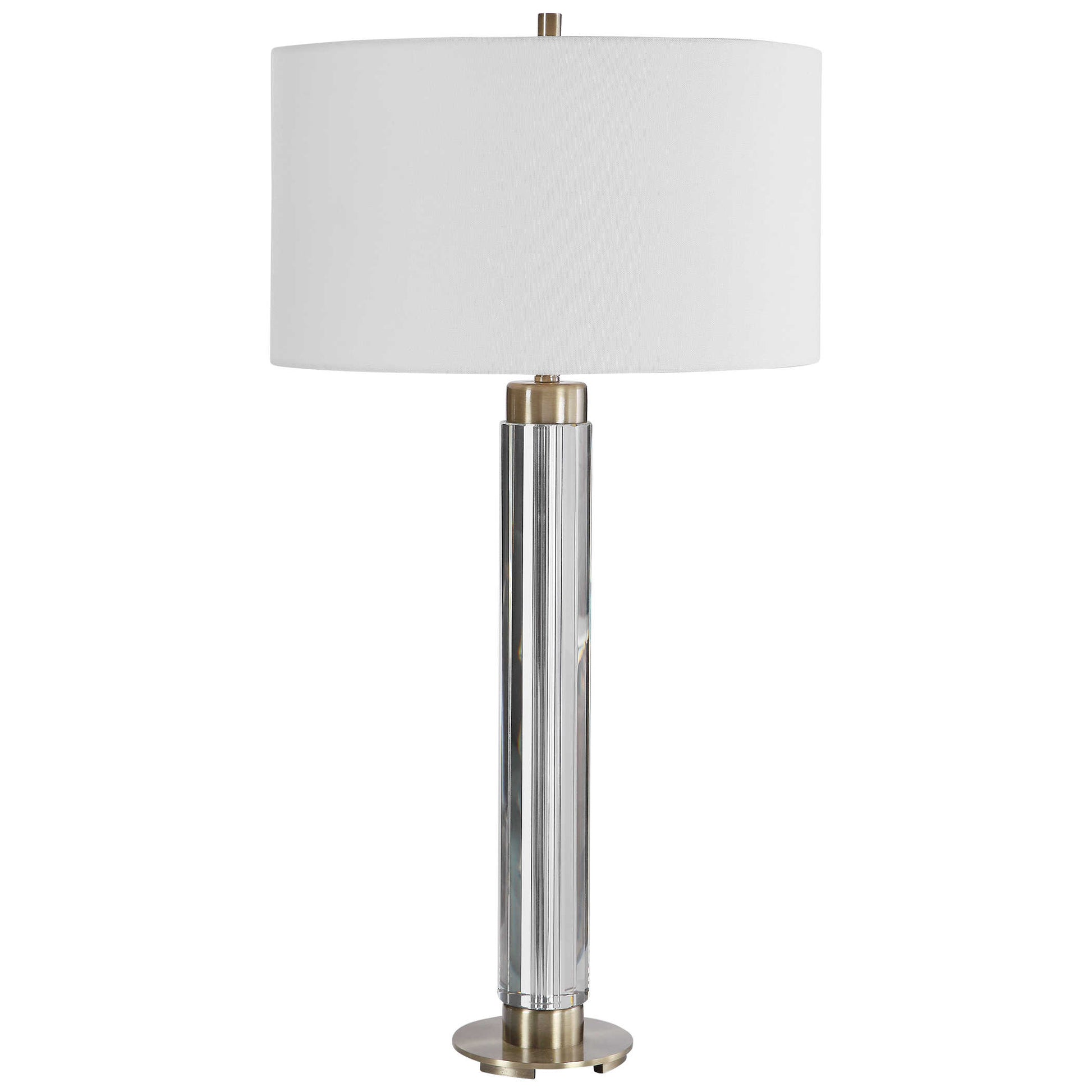 Contemporánea en estilo, esta lámpara de mesa de cristal cortada muestra líneas limpias, acentuadas con detalles ligeramente antiguos chapados en latón. El tono redondo del tambor tapa dura es un tejido de lino blanco.