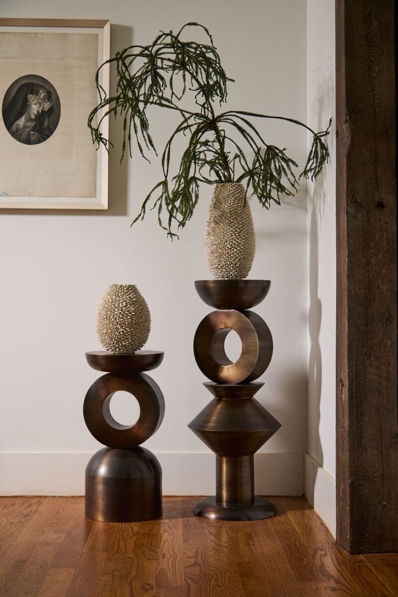 Exhiba la decoración del hogar, las plantas en macetas o las flores con la columna geométrica de hierro Echelon a gran escala. Estos soportes únicos y atemporales ofrecen una altura versátil para diseñar en una mesa elevada o en el suelo, así como para el diseño diario o de eventos.
