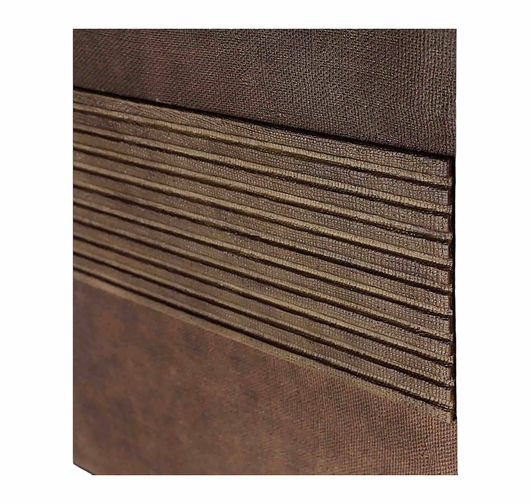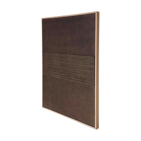 Esta obra de arte mural, elaborada artesanalmente, aporta profundidad y textura gracias al uso de yute natural con un acabado pintado en ricos tonos marrones terrosos. Una banda central de estrías horizontales añade una sutil estructura y un juego de sombras, equilibrando la textura natural con un toque moderno y refinado.