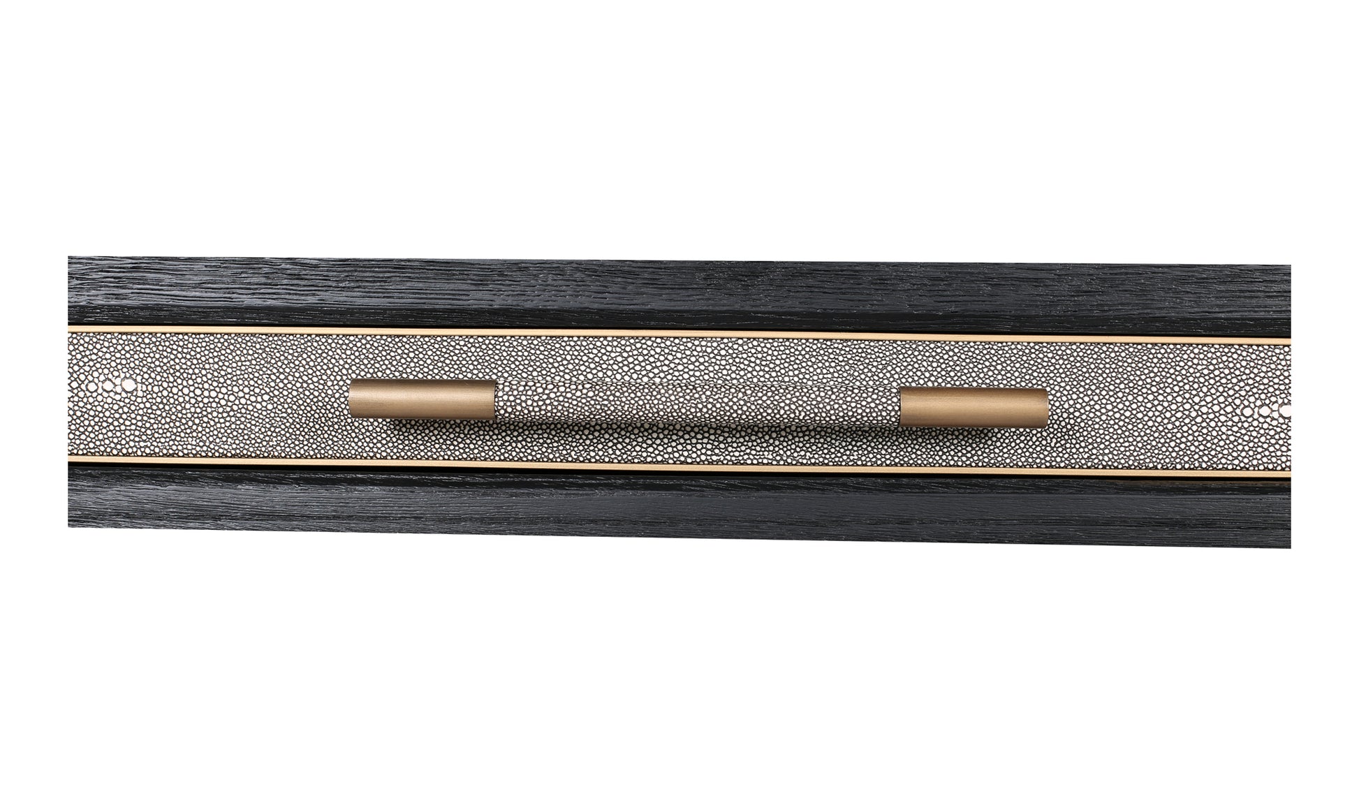 - Un marco de roble negro macizo y detalles de latón, con cuero vegano shagreen