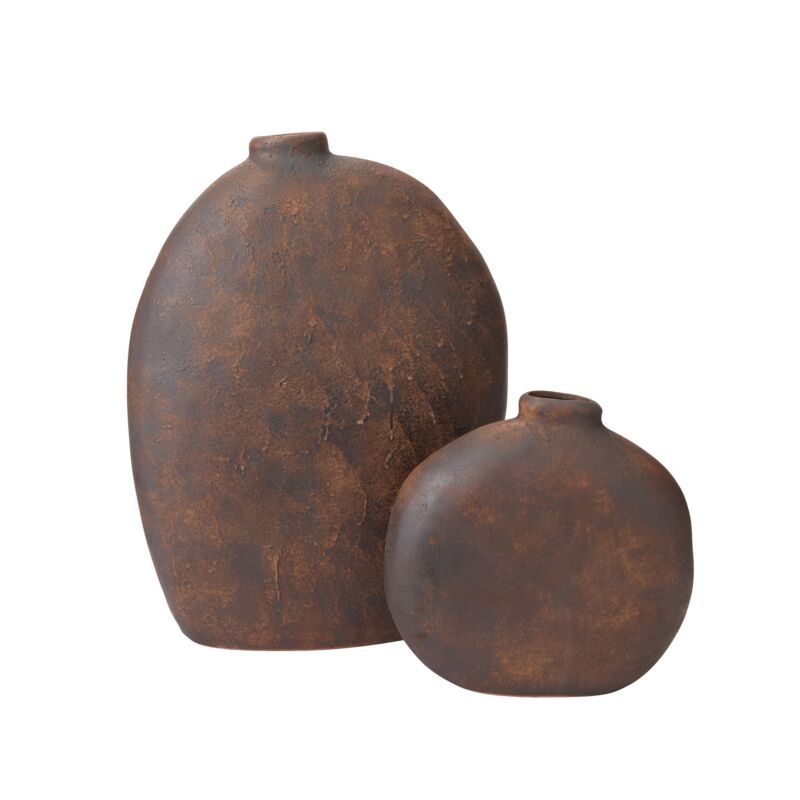 Como un objeto de otro tiempo y lugar, el jarrón Fernando de terracota marrón cálido, hecho a mano, aporta un toque artesanal y antiguo al hogar. Con forma redonda pero poca profundidad, una abertura en forma de botella y una artística superficie craquelada que crea una variedad en el acabado, este jarrón es una adición impresionante a una consola elegante, estanterías o el suelo, combinado con otros recipientes antiguos o neutros.