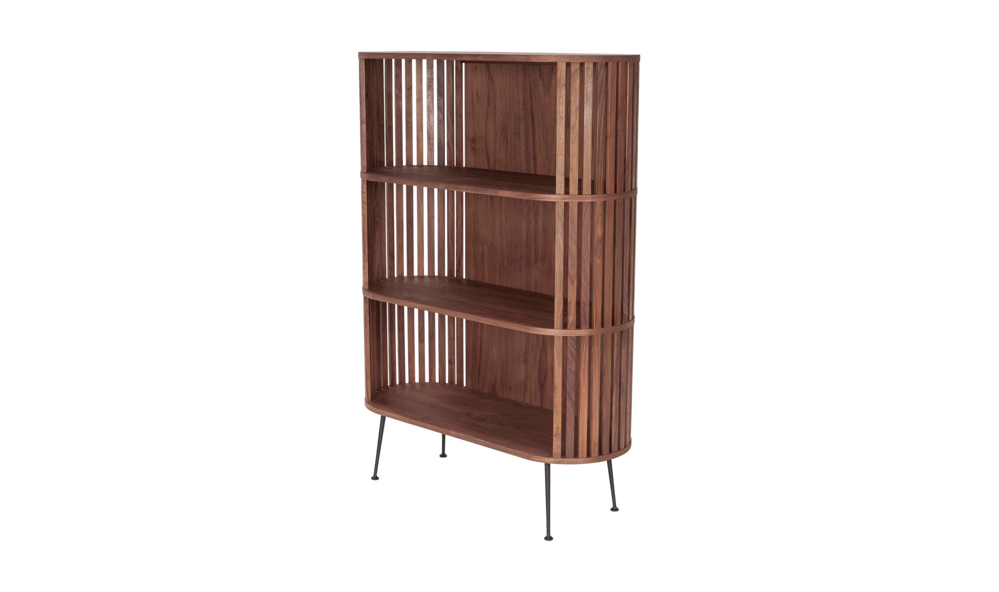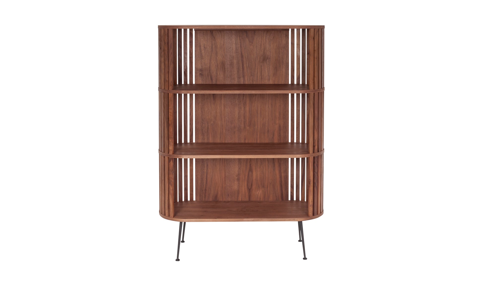 Una pantalla impresionante para sus propias matrices. Ideal para su colección de libros, conchas marinas o whatchamacallits, esta estantería está resplandeciente en nogal macizo ricamente chapado con estantes más profundos incluso para los Taschen más grandes. Estilo moderno de mediados de siglo con una forma suavemente redondeada y paneles cerrados que detallan sus lados y parte trasera, con patas de acero ligeramente acampanadas. Prácticamente perfecta, esta estantería es un estilo multifuncional que funciona de una habitación a otra.