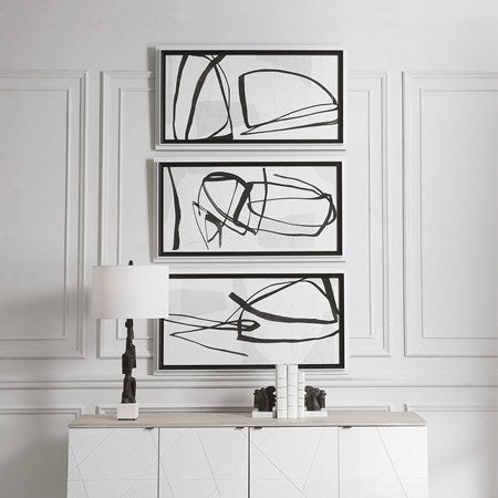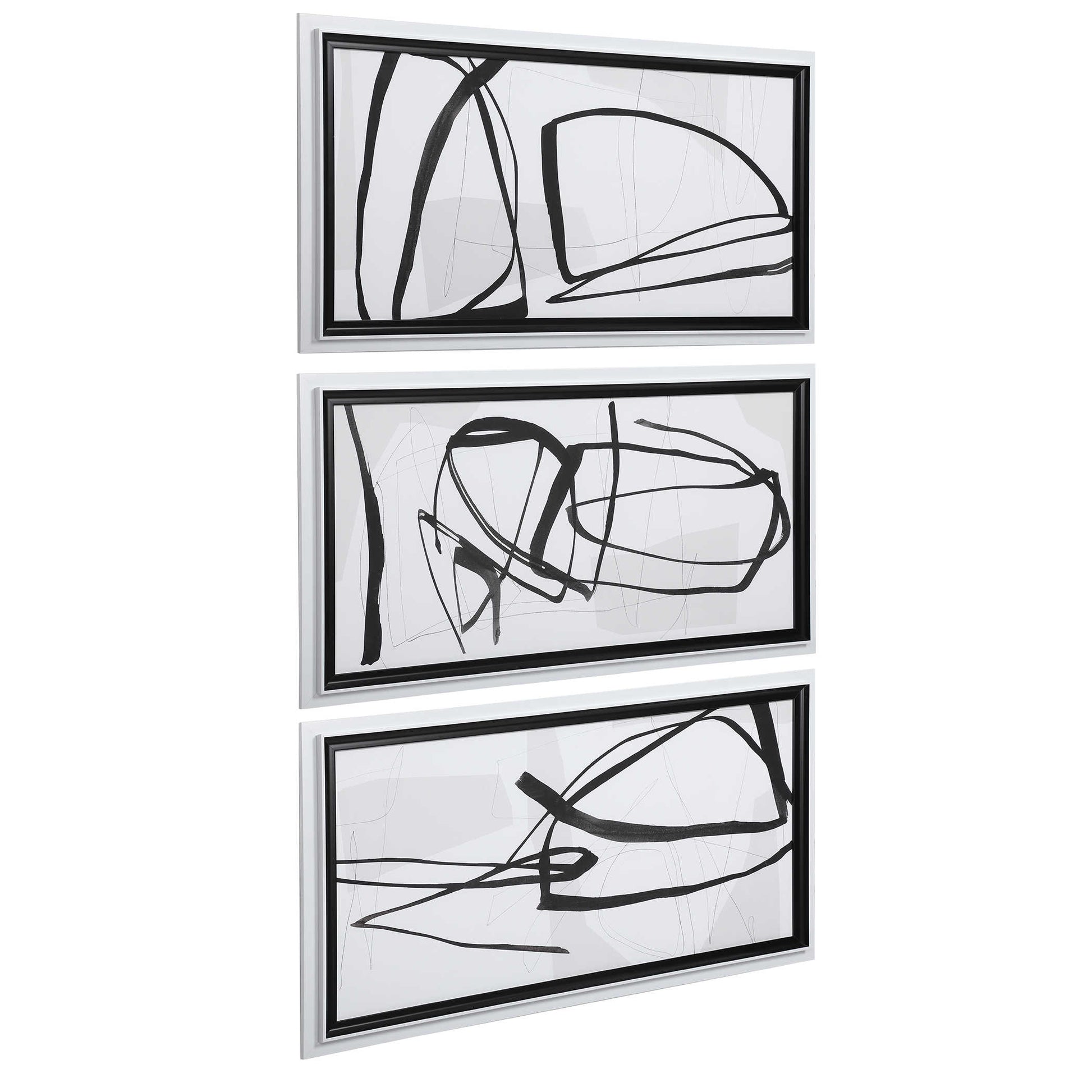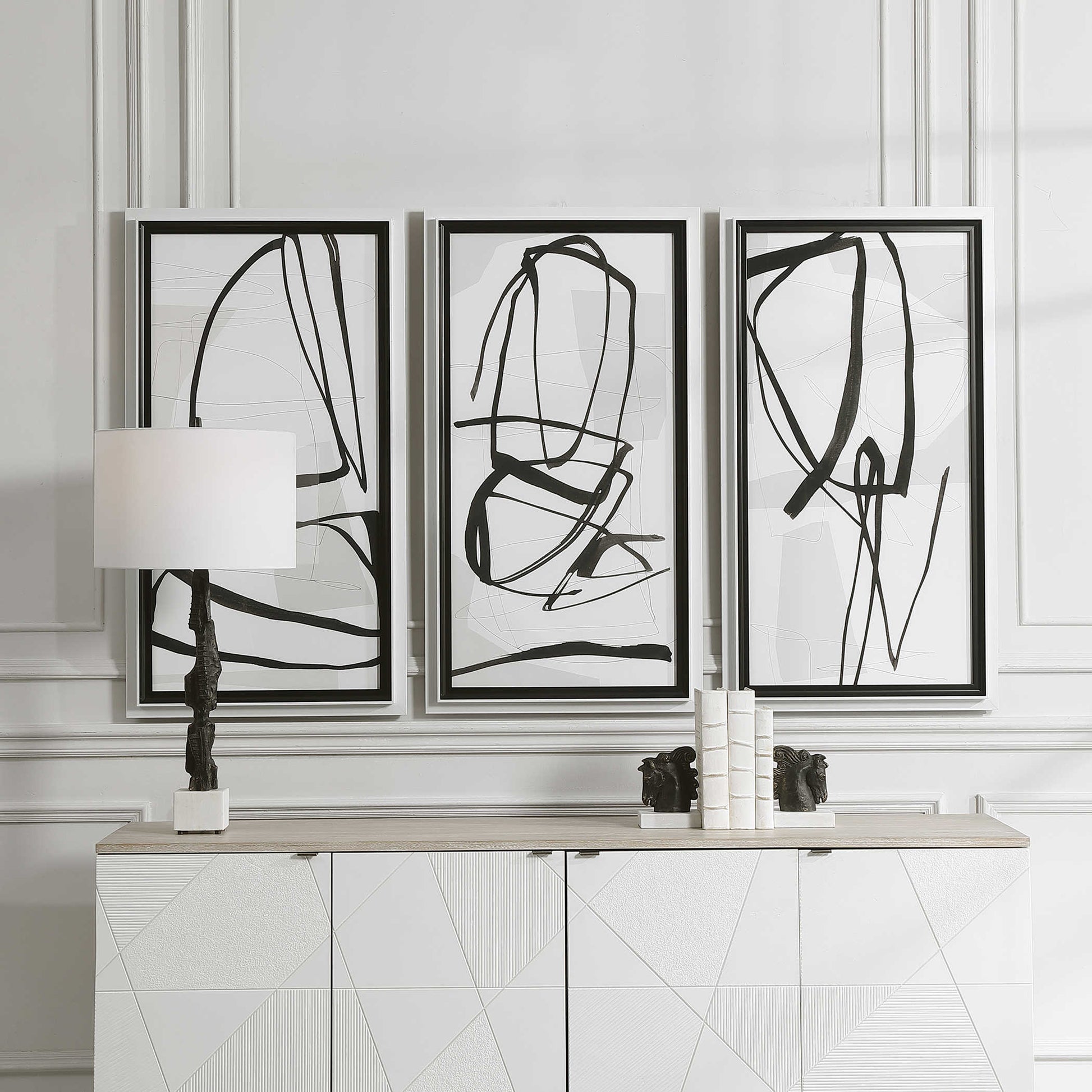 Los resúmenes modernos tienen un aspecto de dibujo a lápiz con bocetos gráficos negros y un fondo bloqueado de color gris claro y blanco. Cada impresión está acentuada por un marco elevador blanco con un revestimiento interior negro debajo del vidrio. Se puede colgar horizontal o verticalmente en cuatro direcciones diferentes para permitir instalaciones de pared verdaderamente únicas. Ilustraciones de Maja Gunnarsdottir.