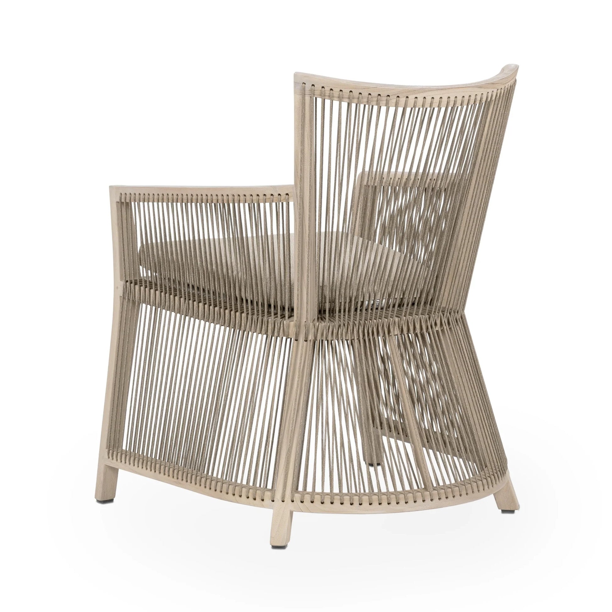 Una interpretación moderna de la artesanía atemporal, la silla decorativa para exteriores Jorah ofrece una estética fresca y sofisticada. Su estructura de madera de teca color crema envejecida está decorada con detalles de cuerda tejida, mientras que un cojín mullido y resistente a la intemperie proporciona el equilibrio perfecto entre estilo y funcionalidad.