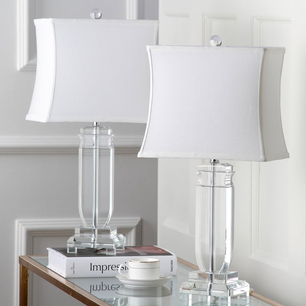 Romántica y femenina, la base de cristal en forma de arpa de la lámpara de mesa Olympia aporta un toque de brillo a las mesas auxiliares del salón y las mesitas de noche del dormitorio. Con base y herrajes plateados, y pantalla rectangular de algodón blanco con tejido de lino, esta Olympia crea un ambiente elegante en la decoración de la habitación. Se vende en juegos de dos.