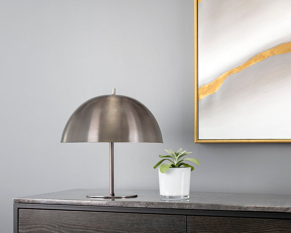 Un diseño clásico con un toque moderno, esta lámpara de mesa iluminará el camino hacia la creatividad. Cuenta con una base de columna de mármol gris con un vástago de hierro de latón mate y una pantalla de hierro plateado antiguo. También disponible con base de mármol blanco y pantalla de hierro dorado. Como el mármol es un material natural, las vetas, picaduras, fisuras, microgrietas y variaciones de color únicas son características que se suman a la singularidad y belleza de cada pieza.