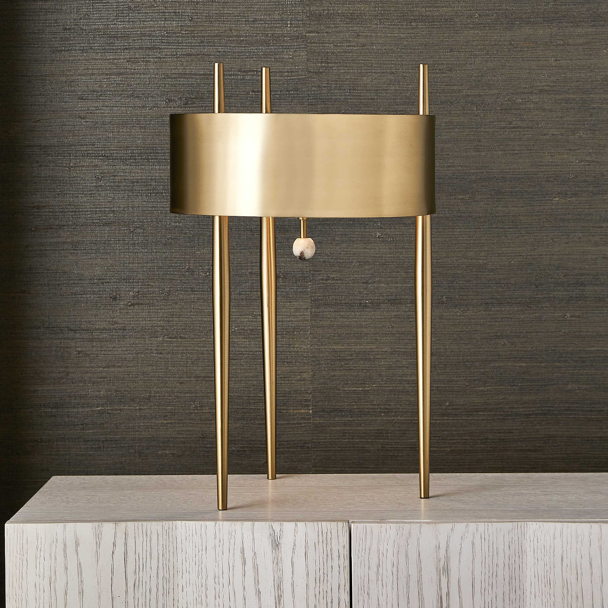 La lámpara de mesa/escritorio Trilogy tiene una pantalla de latón rica y poco profunda suspendida por tres patas cónicas. El atenuador giratorio de ónix en forma de bola centrado debajo de la pantalla agrega un detalle inteligente.