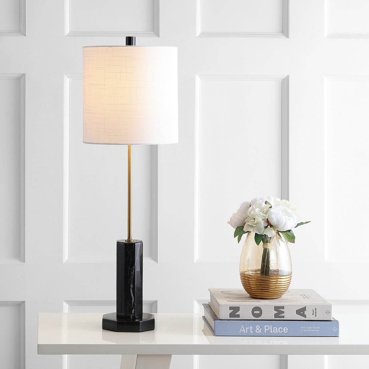 Una maravilla moderna, esta lámpara de mesa contemporánea agrega elegancia a cualquier sala de estar. Su diseño escultórico minimalista está elaborado meticulosamente con una lujosa combinación de mármol negro y latón. A los diseñadores les encanta su tono blanquecino 100% algodón complementario.