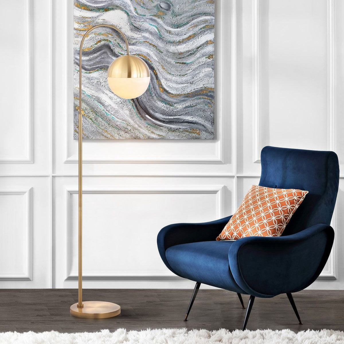 Esta divertida lámpara de pie Jonas refresca cualquier sala de estar con sus curvas cinéticas y su cálido brillo. Las líneas limpias y el llamativo arco de Jonas se combinan con un acabado de latón dorado brillante para darle un toque contemporáneo al estilo vintage. Una pantalla acrílica blanca hace una declaración retro mod.
