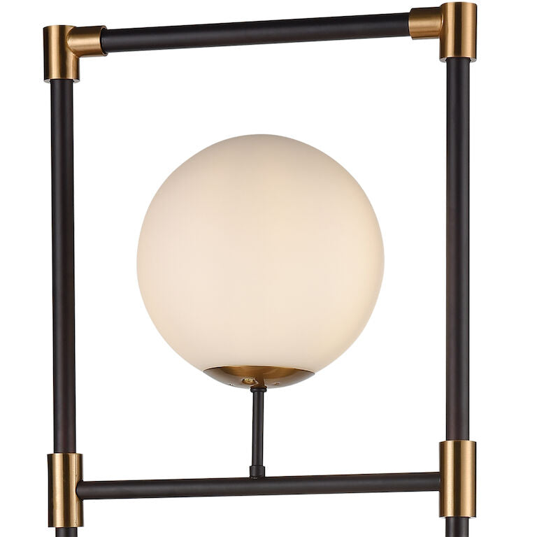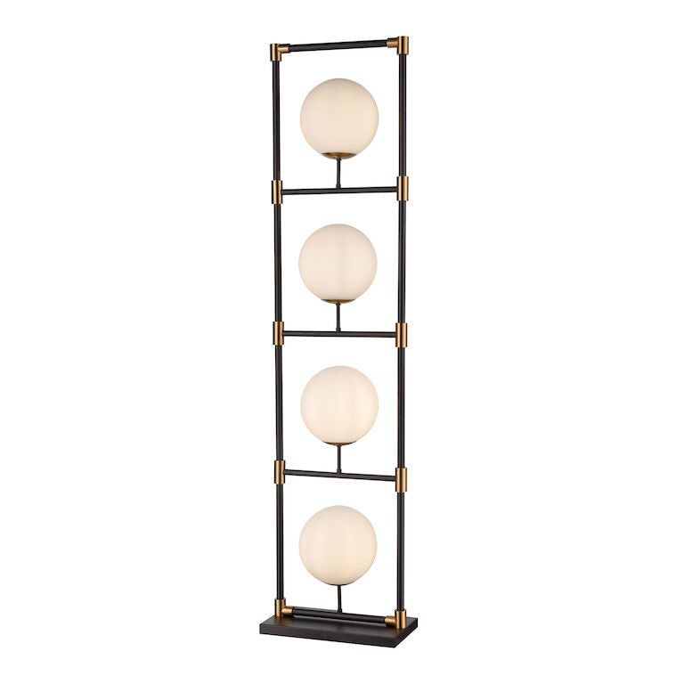 Agregue una estética sutil de mediados de siglo a un interior con esta lámpara de pie estilo escalera. Cuatro pantallas de vidrio soplado a mano se colocan sobre un marco de metal negro mate con detalles de latón envejecido. Estos orbes hechos a mano vienen en un acabado blanco, lo que le da a la luz de la lámpara una calidad tonal adicional. Esta pieza es ideal para un área de entrada donde el espacio y la luz pueden ser una consideración adicional.