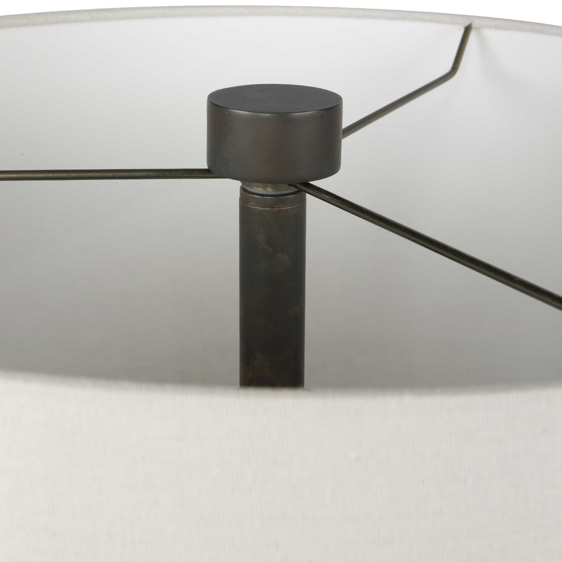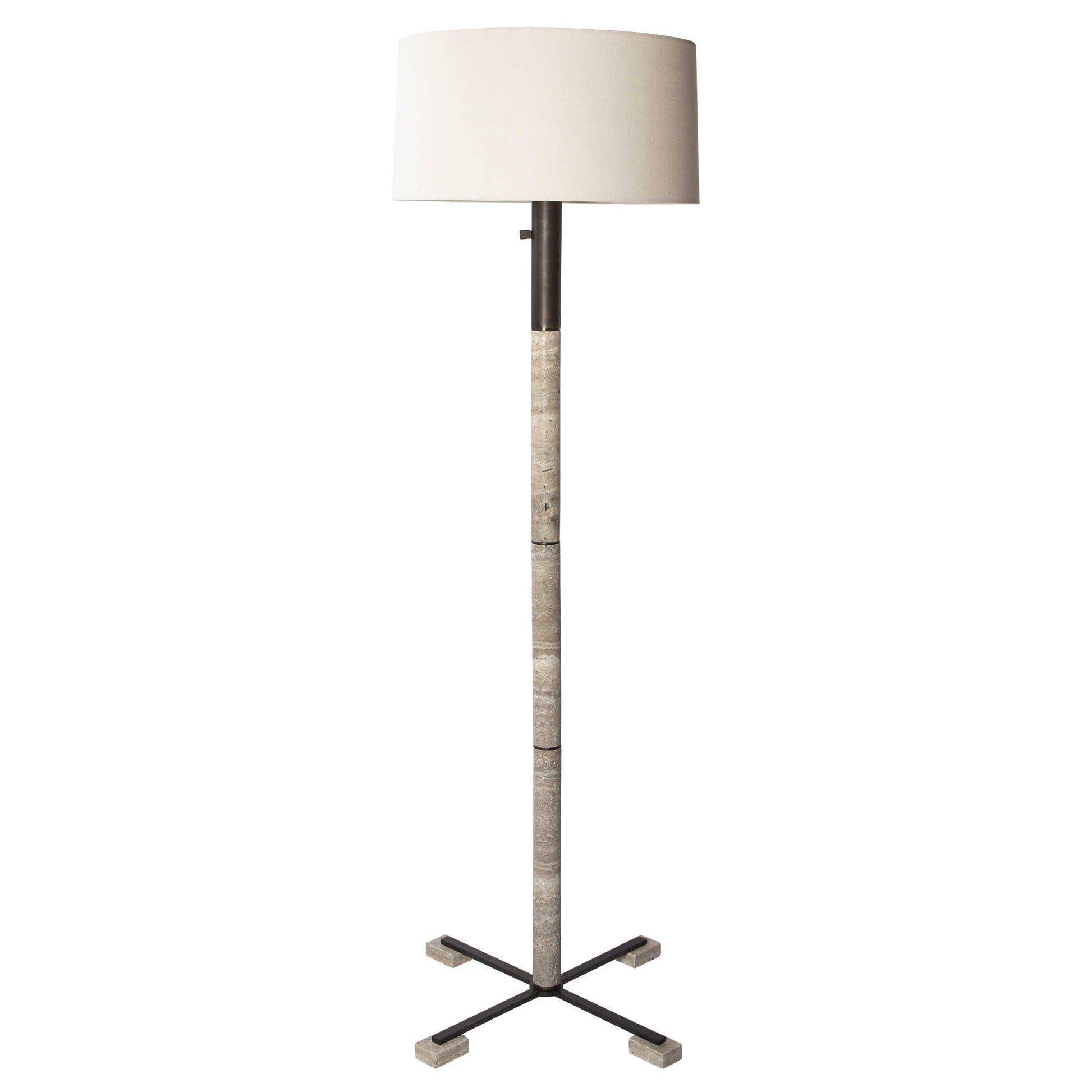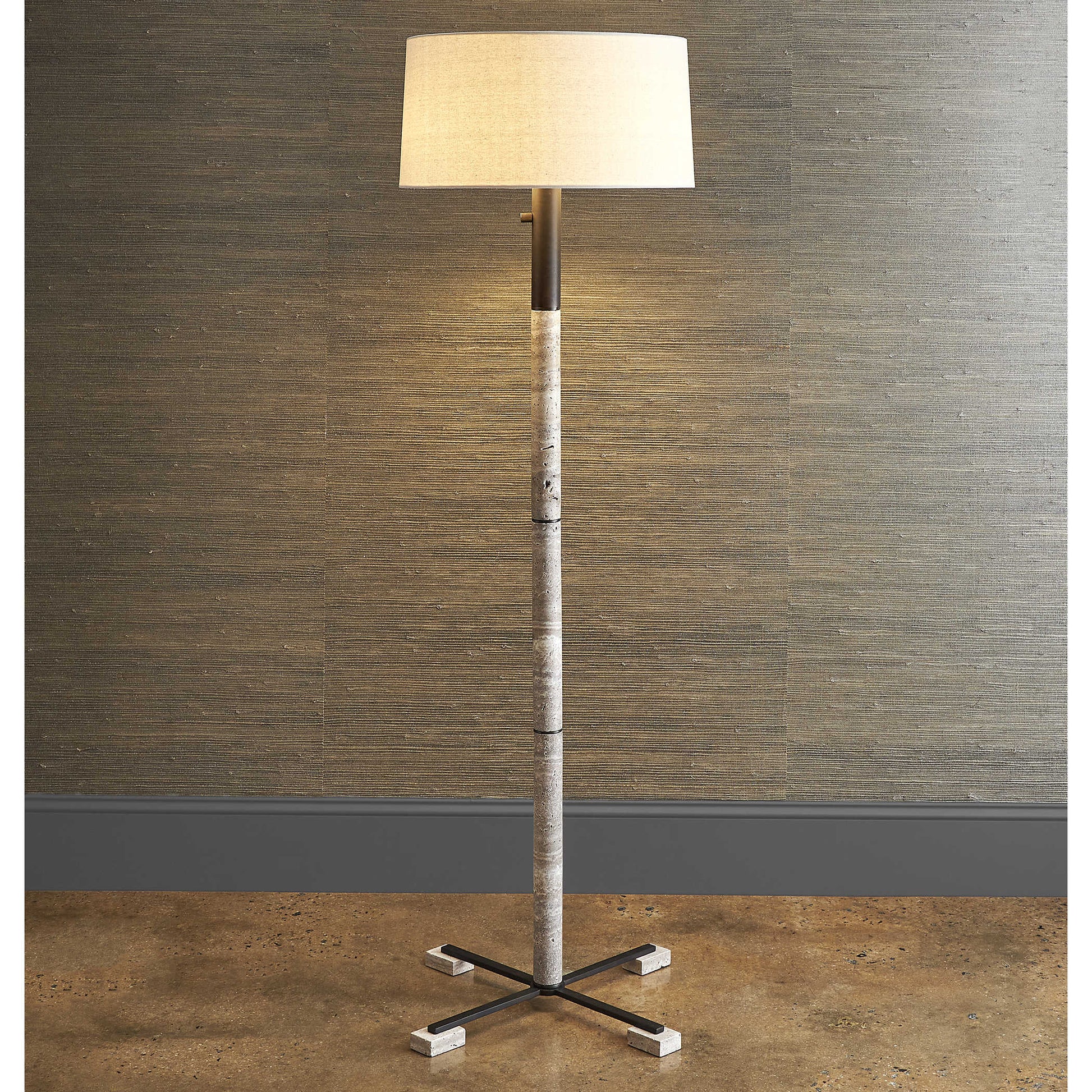 La lámpara de la biblioteca en gris presenta una columna de piedra pulida sin relleno en gris intenso y beige cálido, acentuada con accesorios con un rico acabado en bronce aceitado. La camilla tiene cuatro pies en la misma hermosa piedra. Una pantalla de tambor de tapa dura de lino blanco complementa la pieza. Tiene un interruptor de atenuación ubicado en la columna de bronce y un cable plateado transparente de 20,32cm.