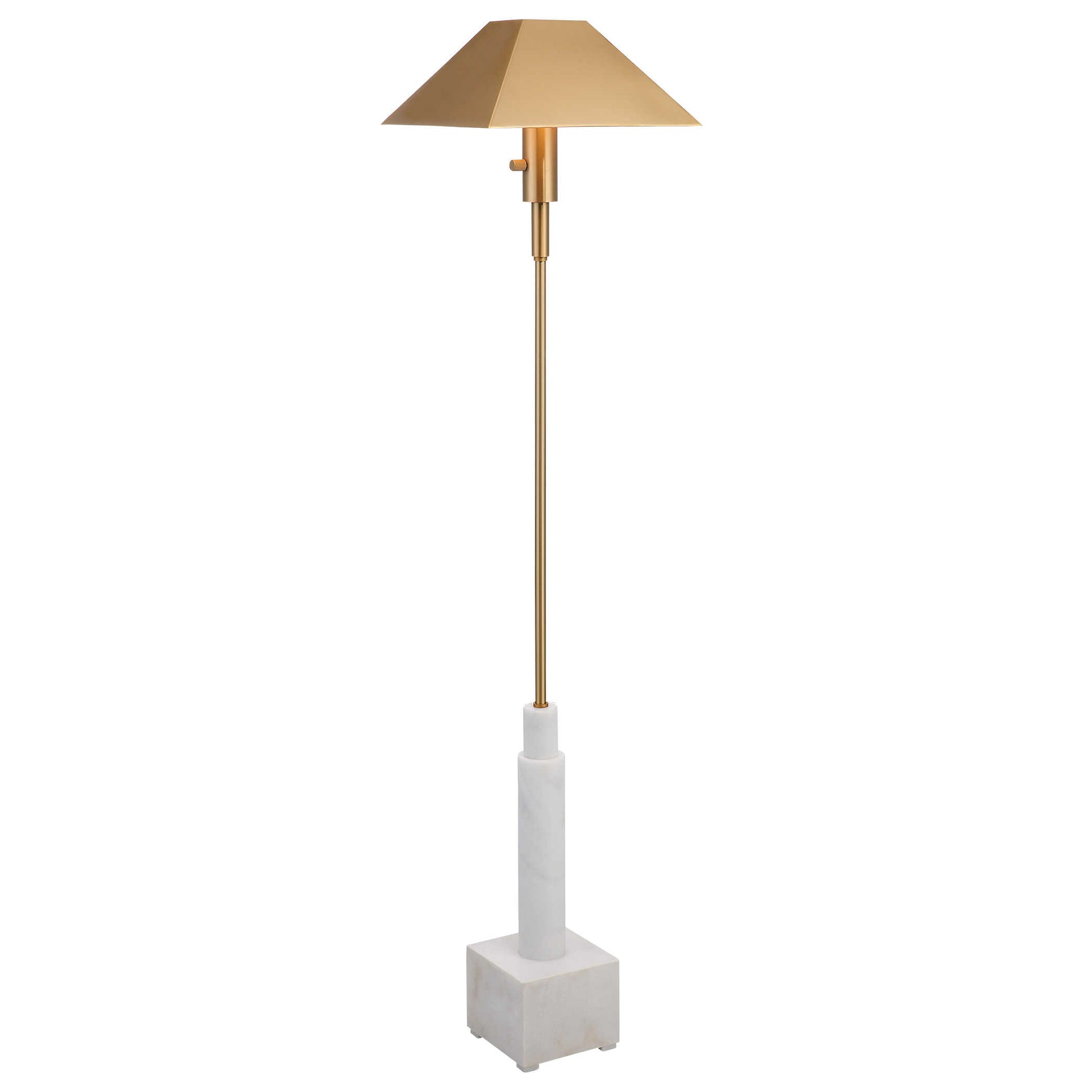 La elegante e inteligente lámpara de pie Telescope es el epítome de la iluminación nítida y funcional. La base de mármol blanco pulido se complementa con una rica columna de latón satinado y una pantalla cuadrada de metal cónico con acabado en latón rico. Con un regulador de intensidad giratorio y proporciones bien pensadas, esta lámpara proporciona la mejor función de iluminación para cualquier asiento de la casa. Su diseño simple y elegante lo hace perfecto en casi cualquier estilo de habitación.