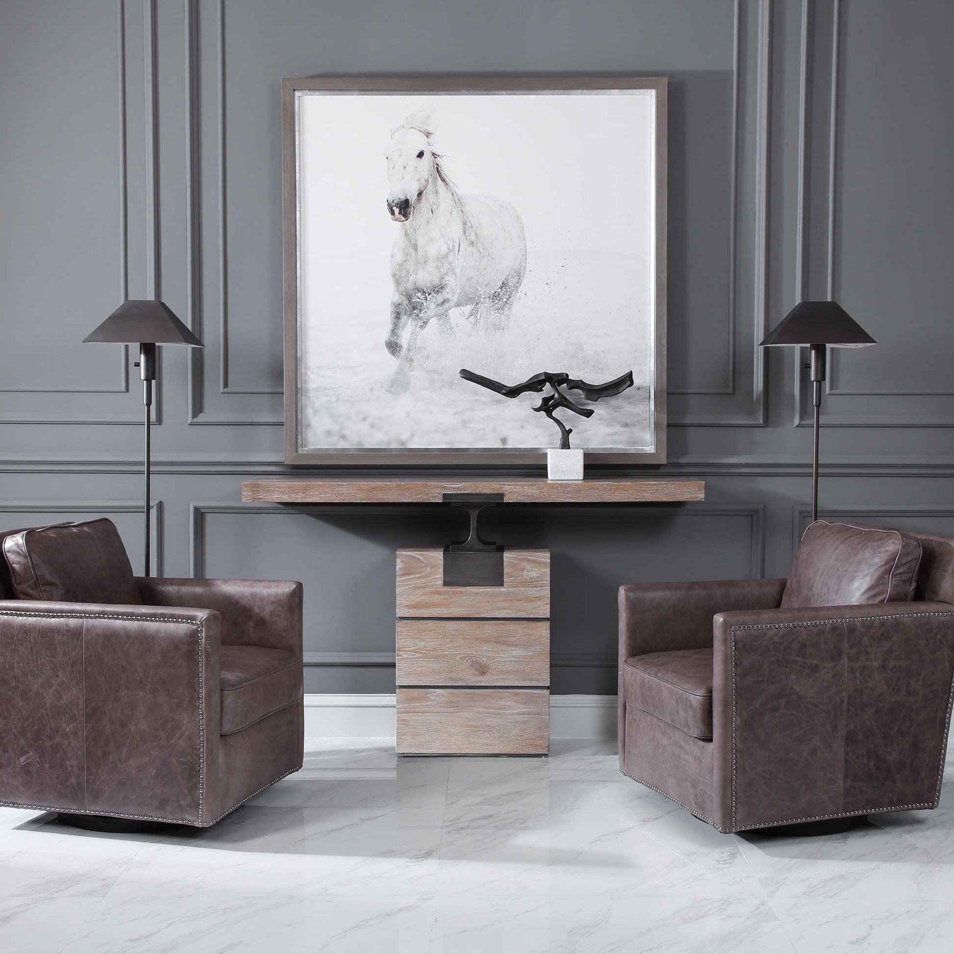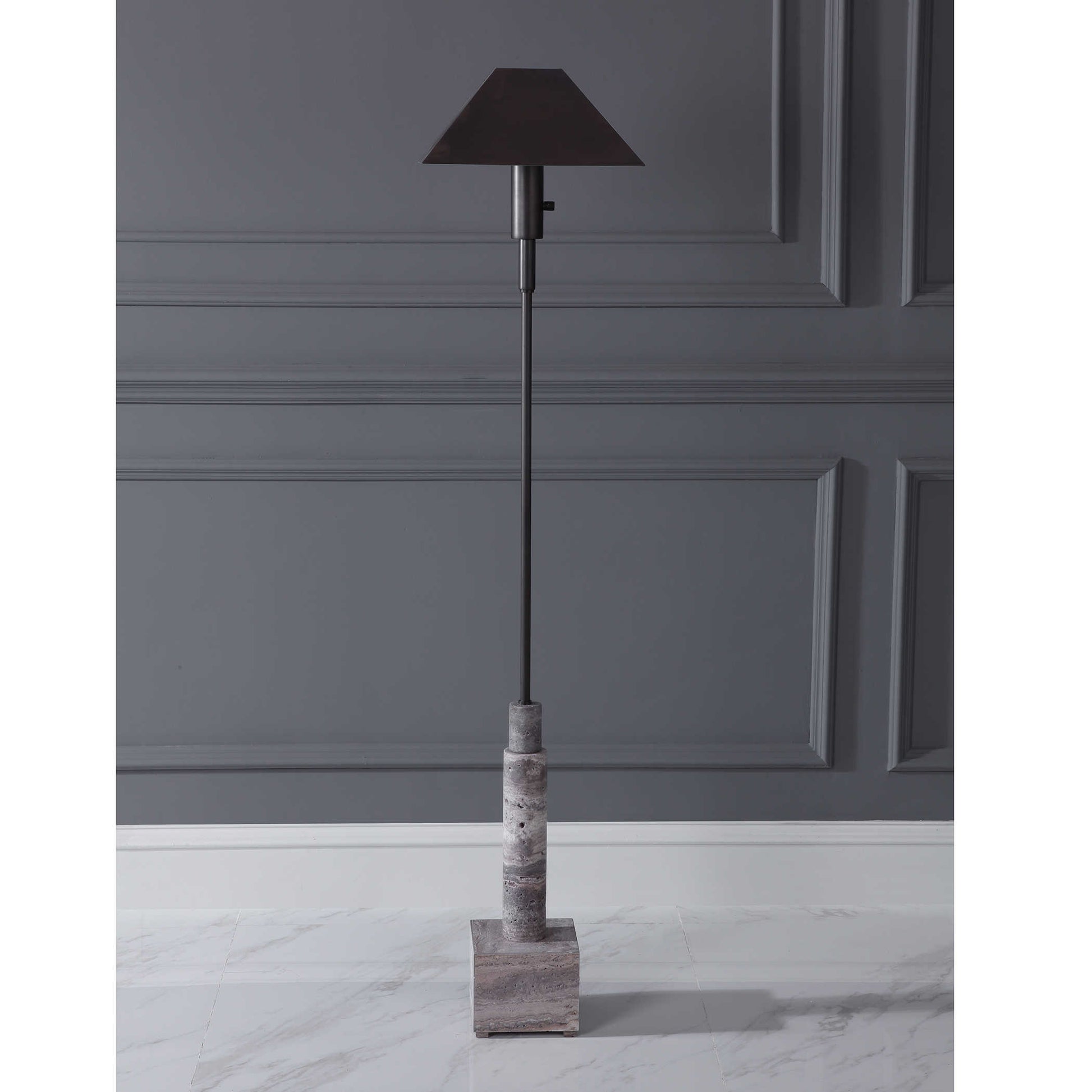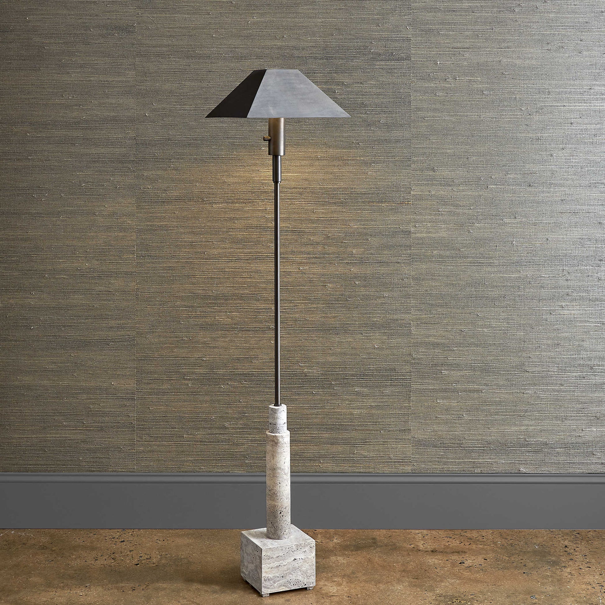 La elegante e inteligente lámpara de pie Telescope es el epítome de la iluminación nítida y funcional. El cuerpo de acero tiene un acabado de bronce al ácido con una pantalla de metal. La base está hecha de una hermosa piedra similar al travertino sin relleno, natural y pulida, en varios tonos de gris y gris pardo. Con un interruptor de atenuación y proporciones bien pensadas, esta lámpara proporciona la mejor función de iluminación para cualquier asiento de la casa. Su diseño simple y elegante lo hace perfecto en casi cualquier estilo de habitación.