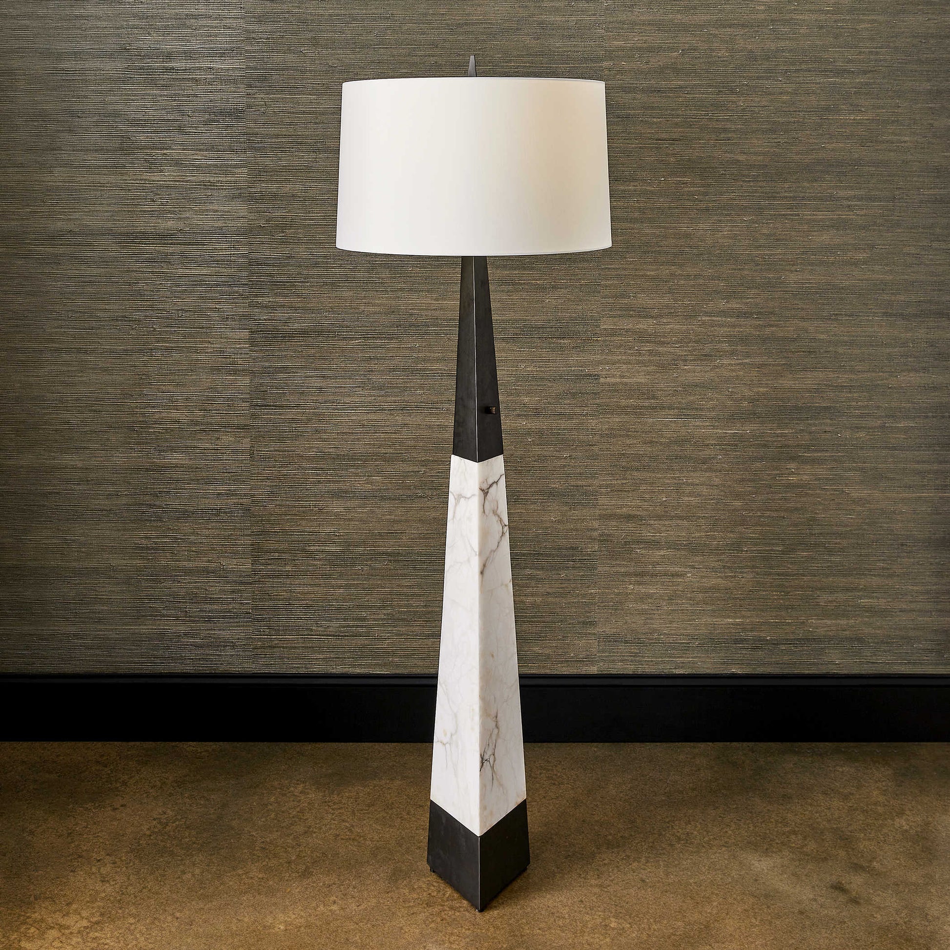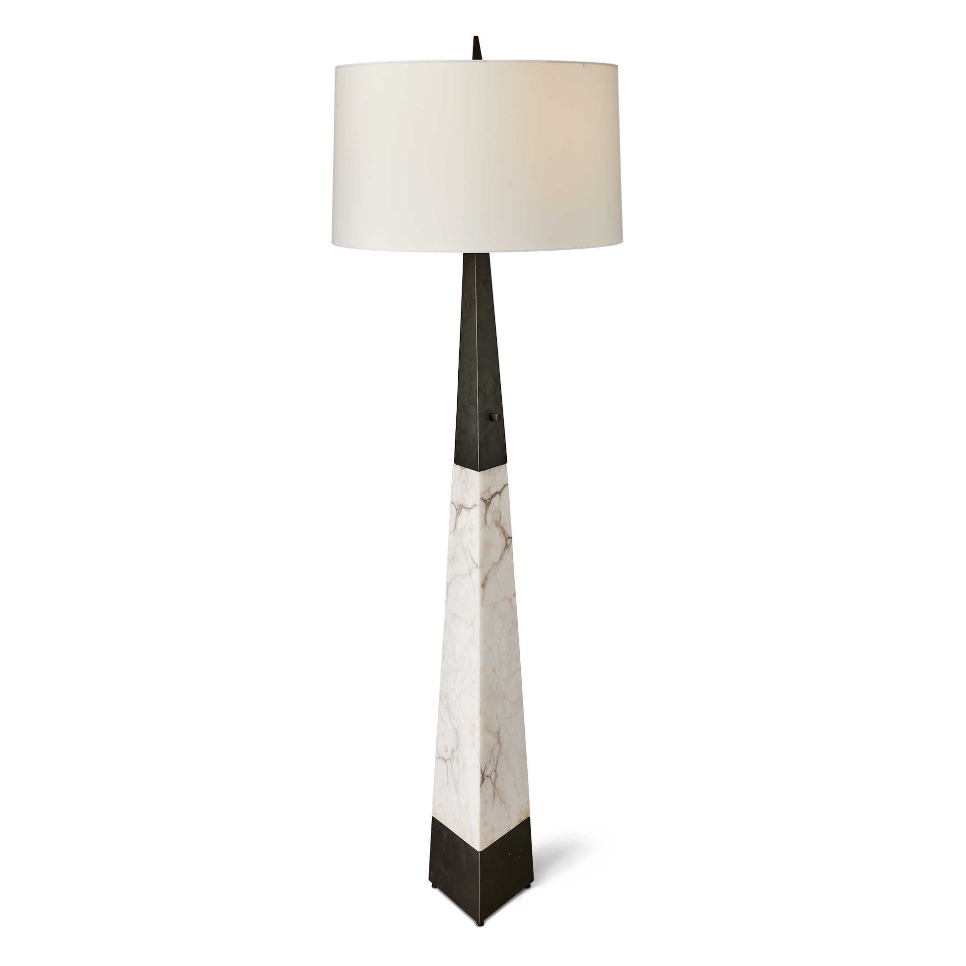 La lámpara de pie Trian presenta una pirámide de tres lados delgada y ahusada que expande la longitud de la lámpara. El centro de alabastro se sostiene entre una base y una tapa con acabado bronceado. La pantalla es una tapa dura ahusada en lino blanco y la luz se puede controlar con un atenuador giratorio integrado en la base.