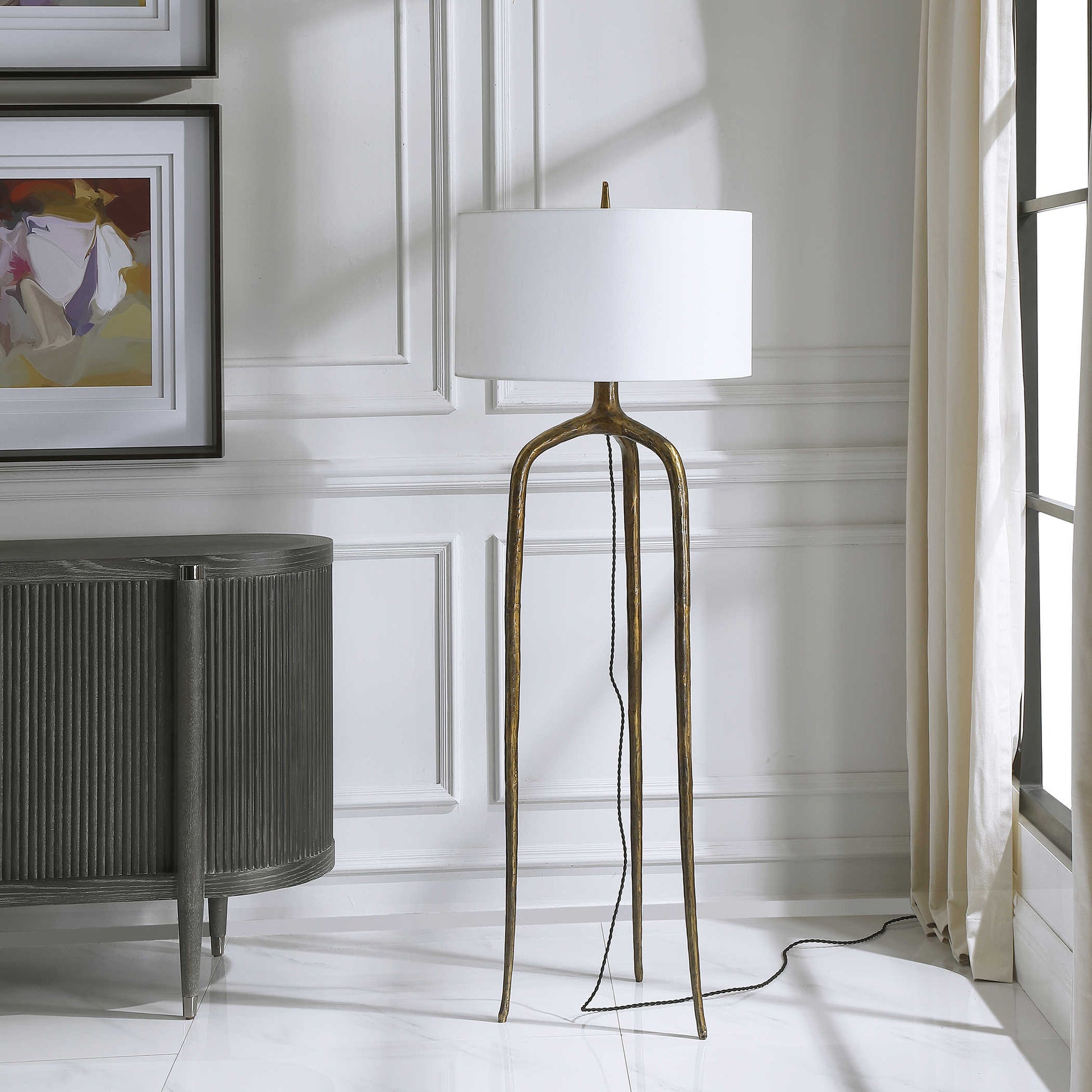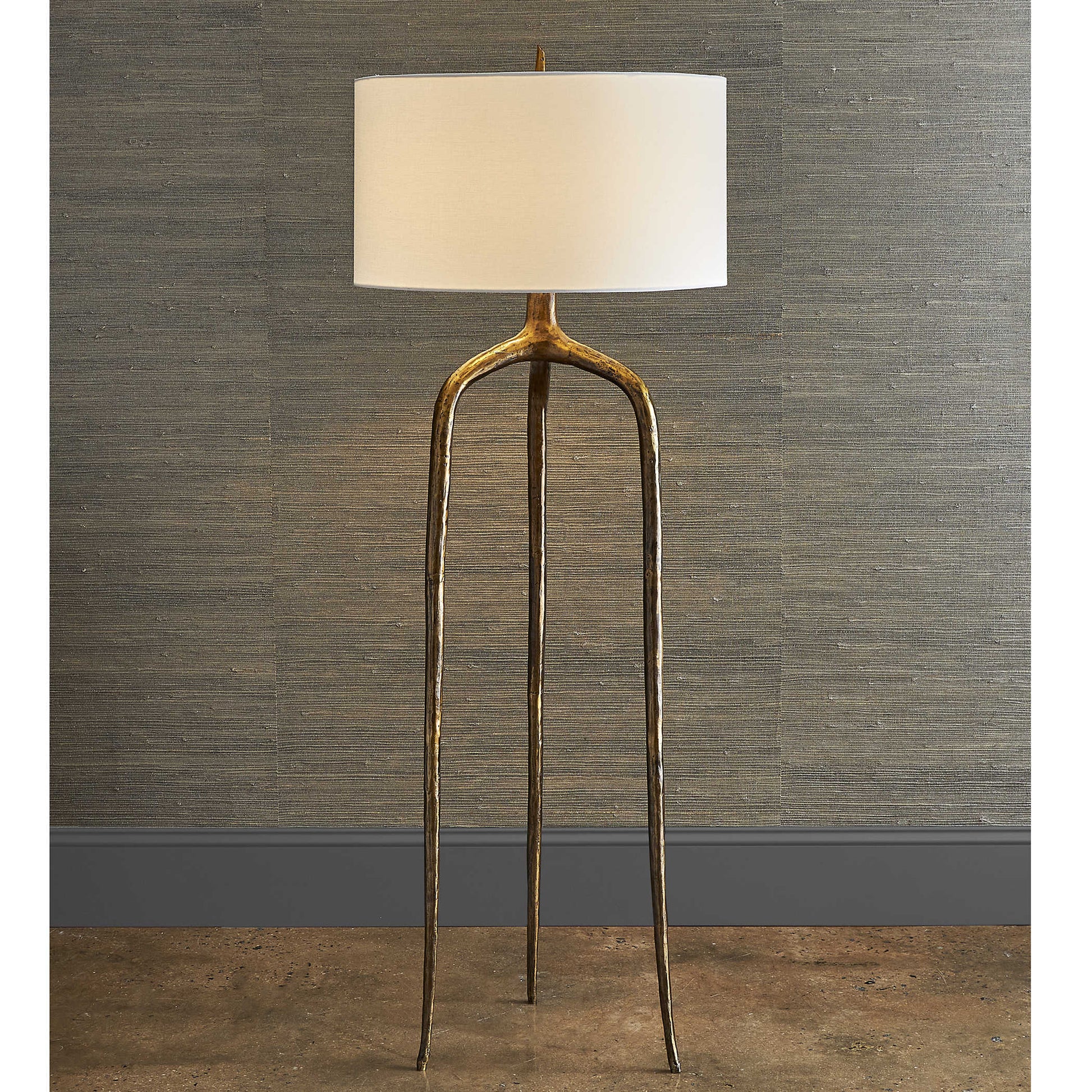 La lámpara de pie Wish Bone de gran escala está hecha de hierro fundido con un acabado de latón envejecido sobre una textura orgánica y un cordón francés envuelto en tela. La gran pantalla del tambor de tapa dura está cubierta con tela de lino blanco.