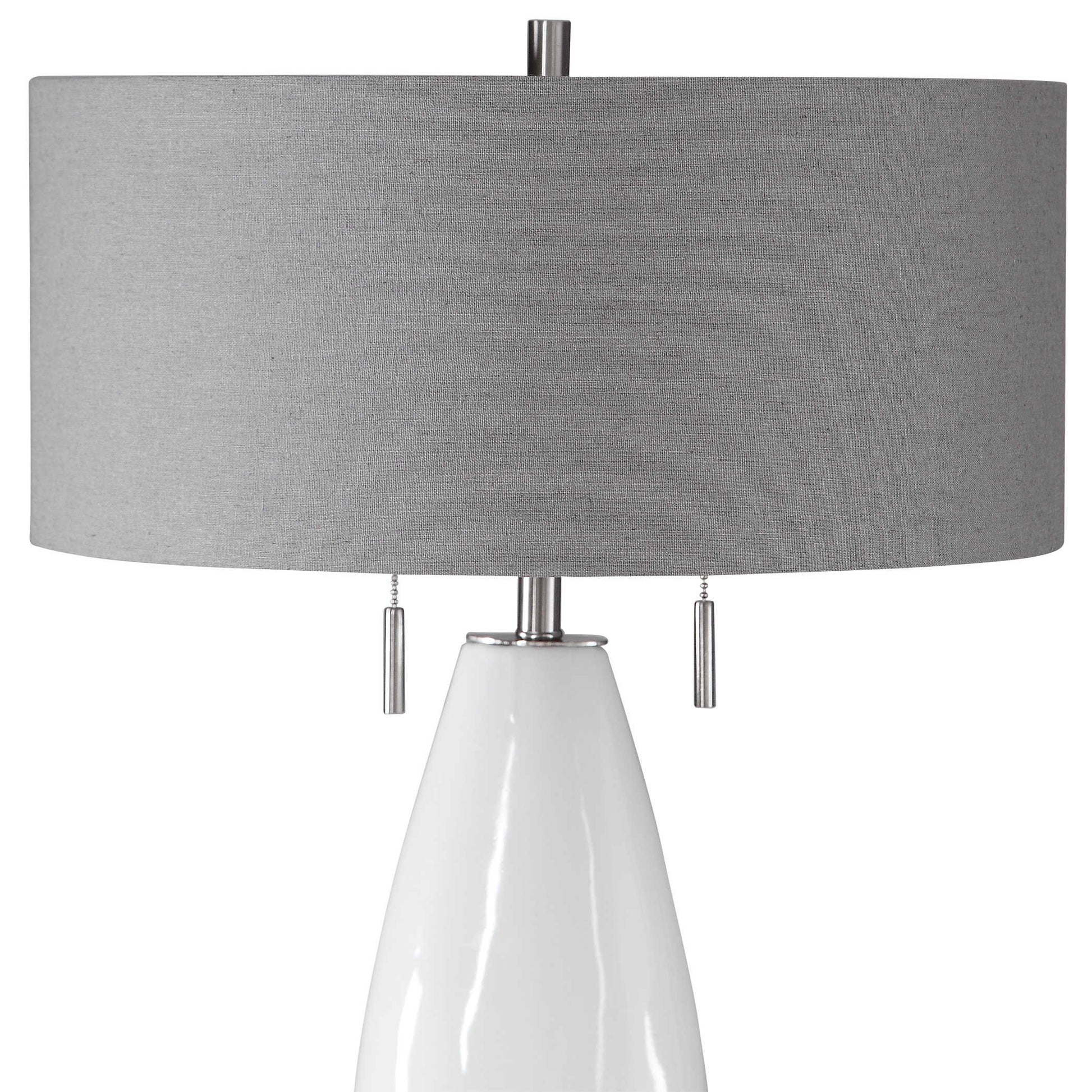 Con un estilo contemporáneo, esta lámpara de mesa de cerámica cuenta con una base de forma orgánica en un esmalte blanco, acentuada con un grueso pie de cristal y detalles cepillados niquelados. El tono redondo del tambor hardback es un tejido de lino gris.