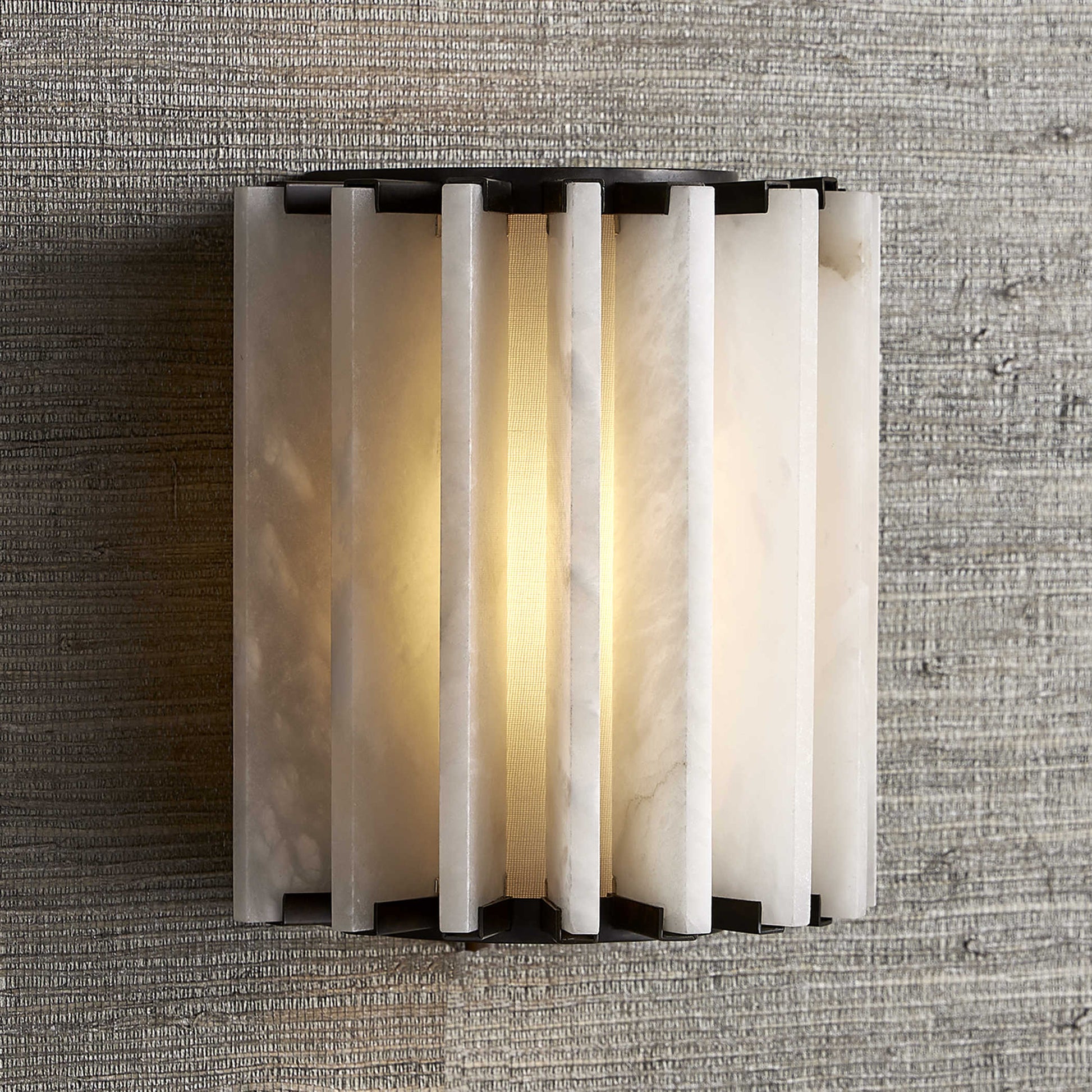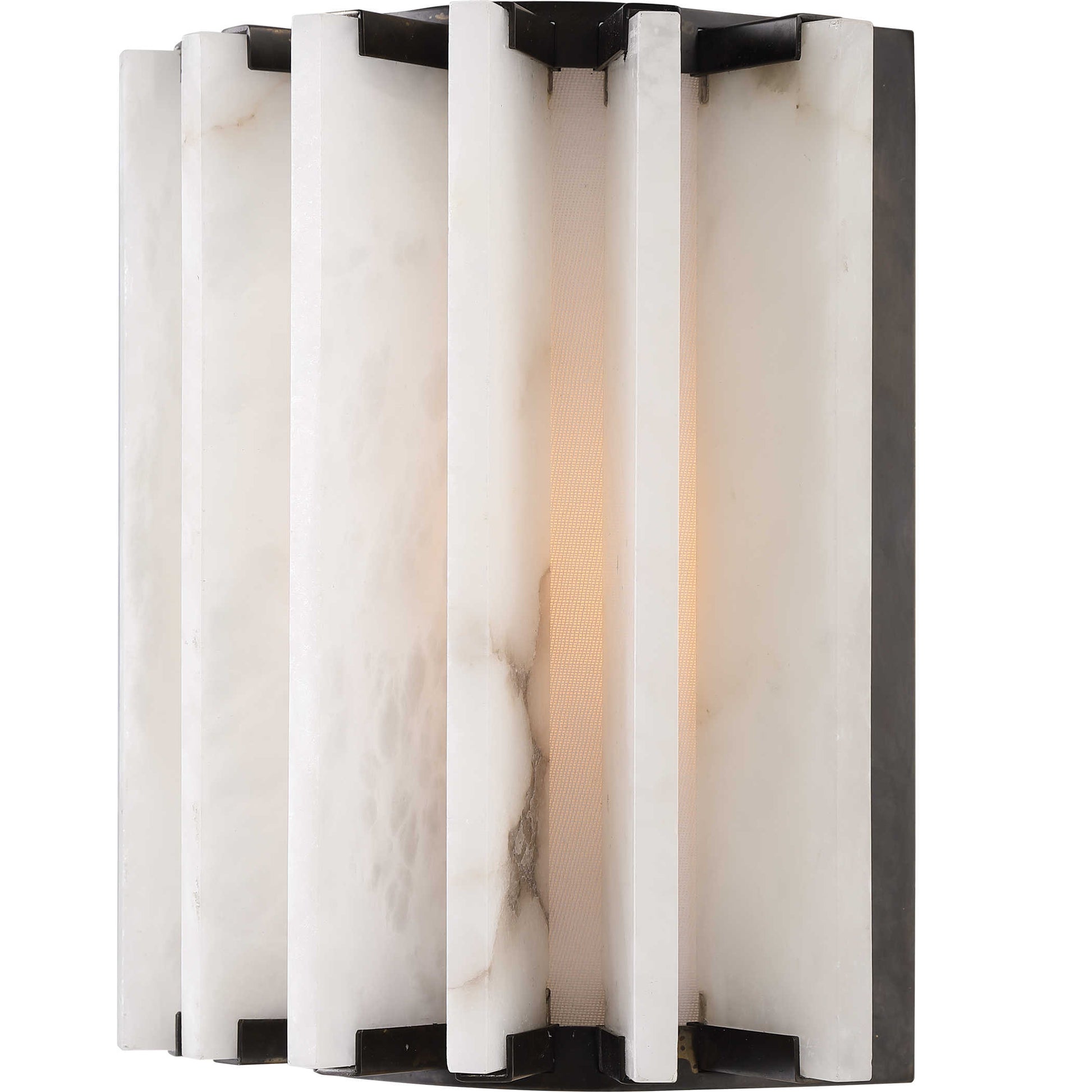 Las líneas de declaración arquitectónica producen un marco estructural suavizado con baldosas lisas naturales de alabastro cremoso translúcido que cultivan una apariencia aerodinámica para este aplique de 1 Lt. El acabado de bronce oscuro oxidado plateado le da profundidad al aplique, mientras que un tono de la funda interior de lino blanco oscurece la bombilla realzando el brillo cálido. 1-40 vatios máx. toma de candelabro.