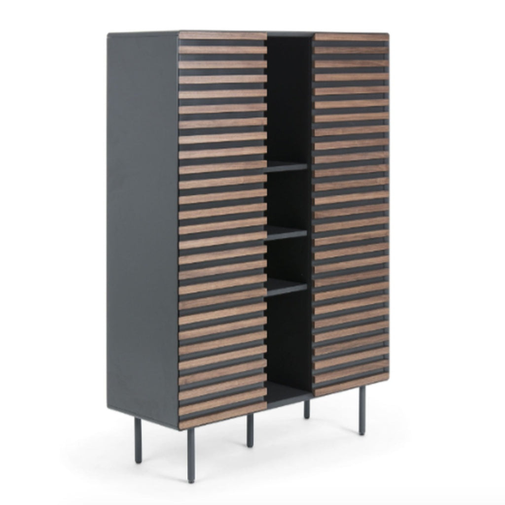 La chapa de nogal en el frontal de las puertas es la clara protagonista en esta estantería, con un amplio espacio de almacenaje, visible y tapado, lugar suficiente para mantener el orden en tus estancias a la vez que añades estilo.