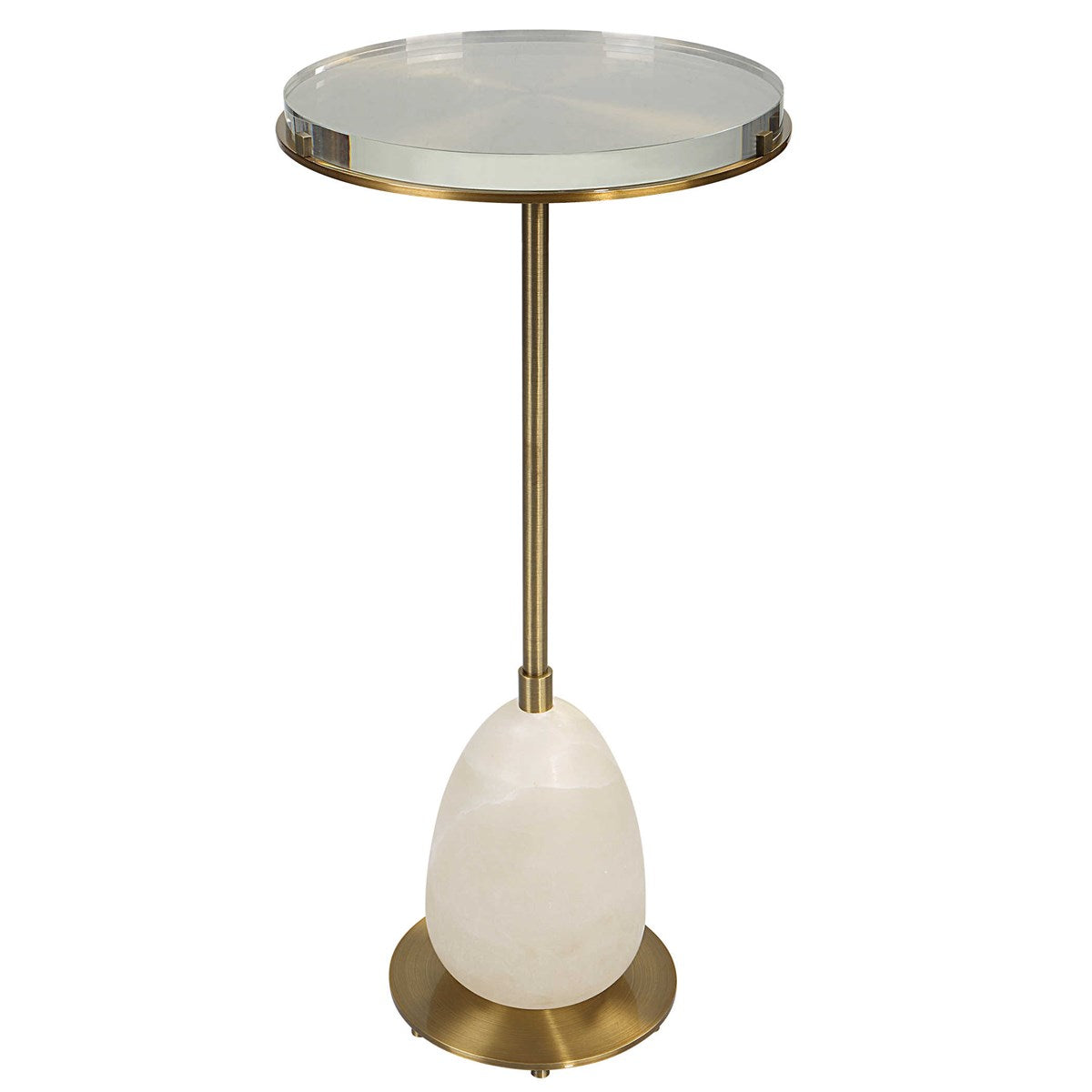 Impresionante e ingenioso, un huevo de alabastro de gran tamaño admite una selección de dos alturas de tallo. Elija entre los tallos incluidos el que mejor se adapte a su espacio para lograr una altura final de 21,5" o 24,5". La parte superior de cristal grueso descansa dentro de una placa con acabado de latón. Debido a las características naturales del alabastro, cada pieza tendrá patrones de vetas únicos.