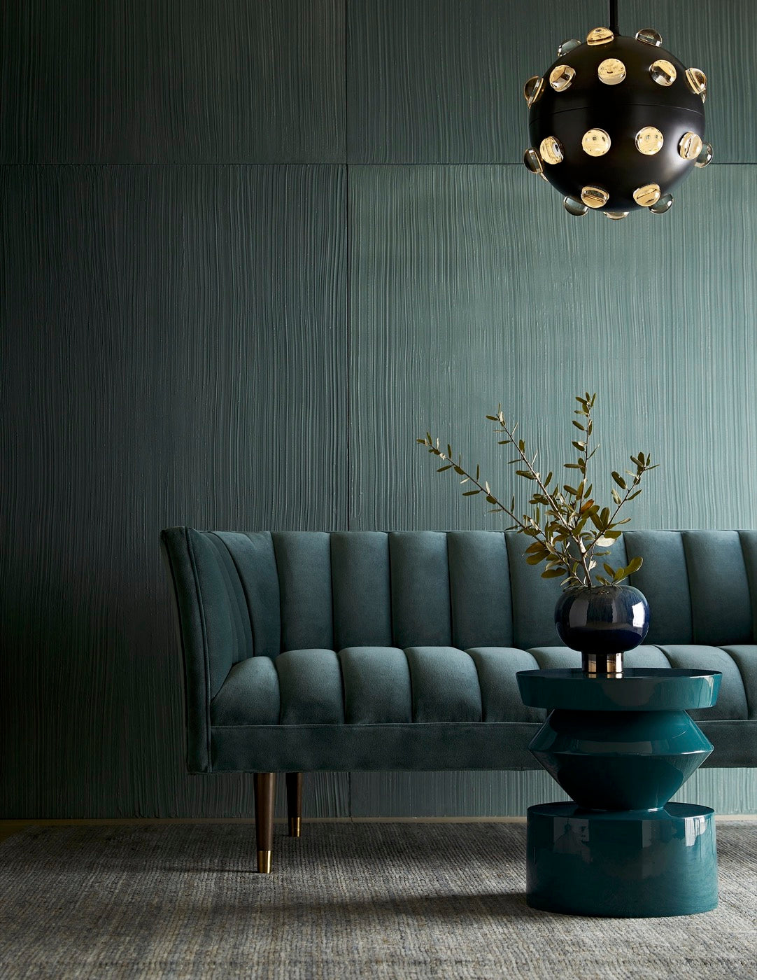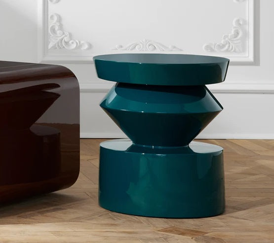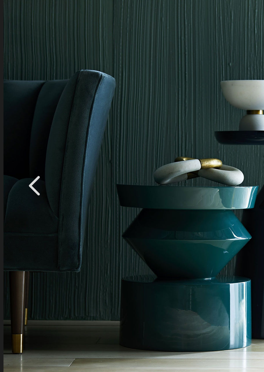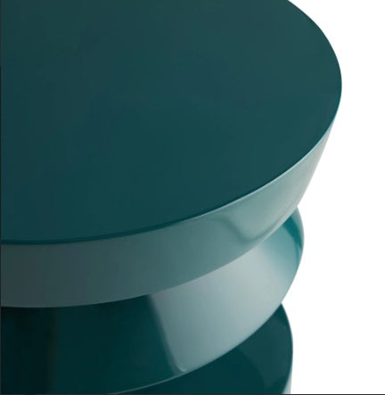 La parte superior suave y redondeada se complementa con una pieza central que parece girar hacia la parte inferior, llamando la atención sobre el juego único de geometría. Un rico acabado en laca de pavo real brinda un brillo elegante que iluminará una habitación y al mismo tiempo agregará un refrescante toque de color.