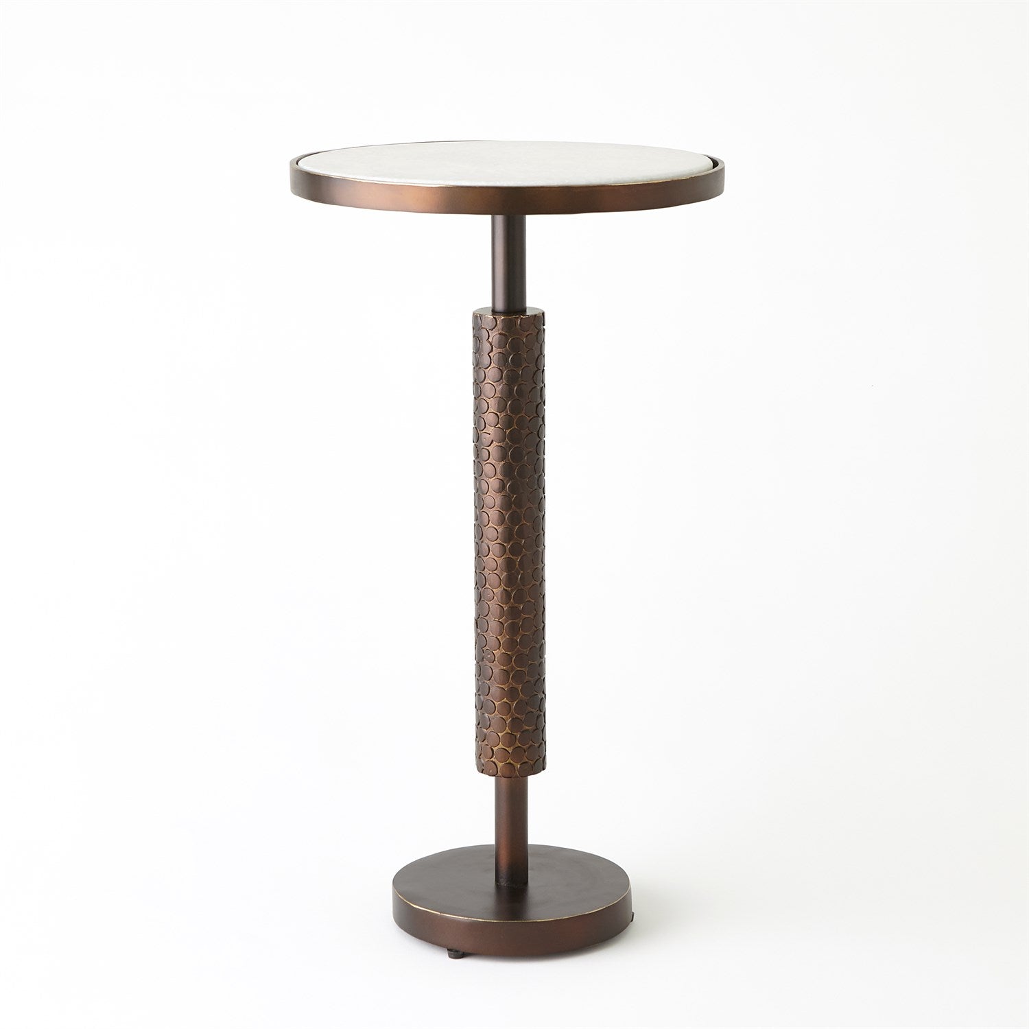 Magníficamente texturizado con un patrón similar a un guijarro. Base de hierro con acabado en níquel envejecido y tapa de mármol gris.