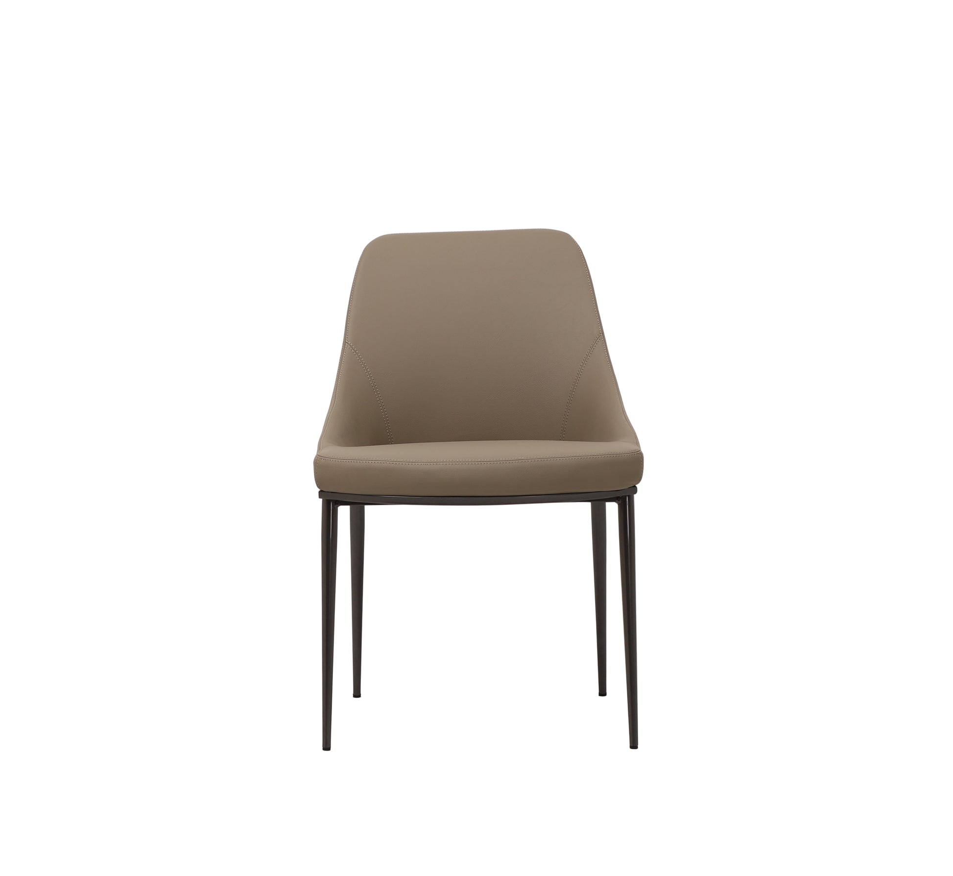 Esta silla presenta un diseño elegante y minimalista, ideal para espacios contemporáneos. Su asiento y respaldo están tapizados en un material tipo piel de color beige topo, que aporta un aspecto sobrio y sofisticado. La forma ergonómica del respaldo ofrece comodidad, mientras que las patas delgadas de metal en acabado oscuro le dan ligereza visual y estabilidad. Es perfecta para comedores modernos o salas de reuniones con estilo.