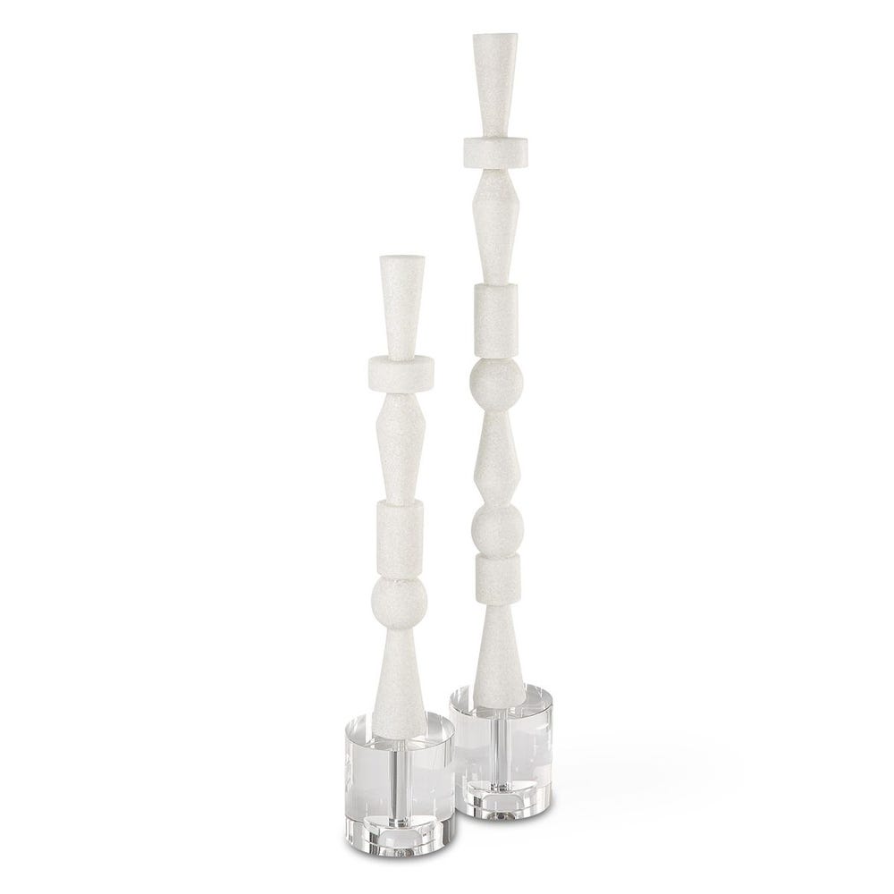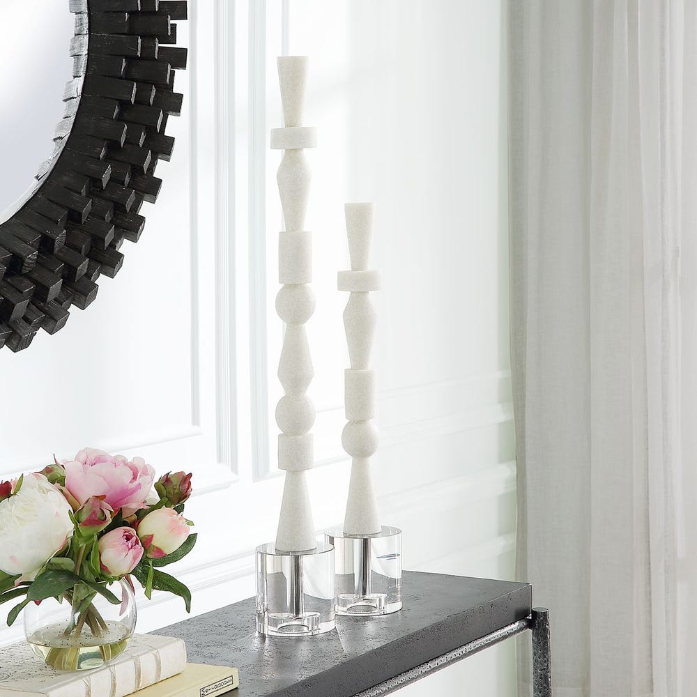 Tótems geométricos apilados, elaborados con piedra artificial color marfil, que reproducen con precisión el aspecto del mármol de Tasos y están realzados por una elegante base de cristal.