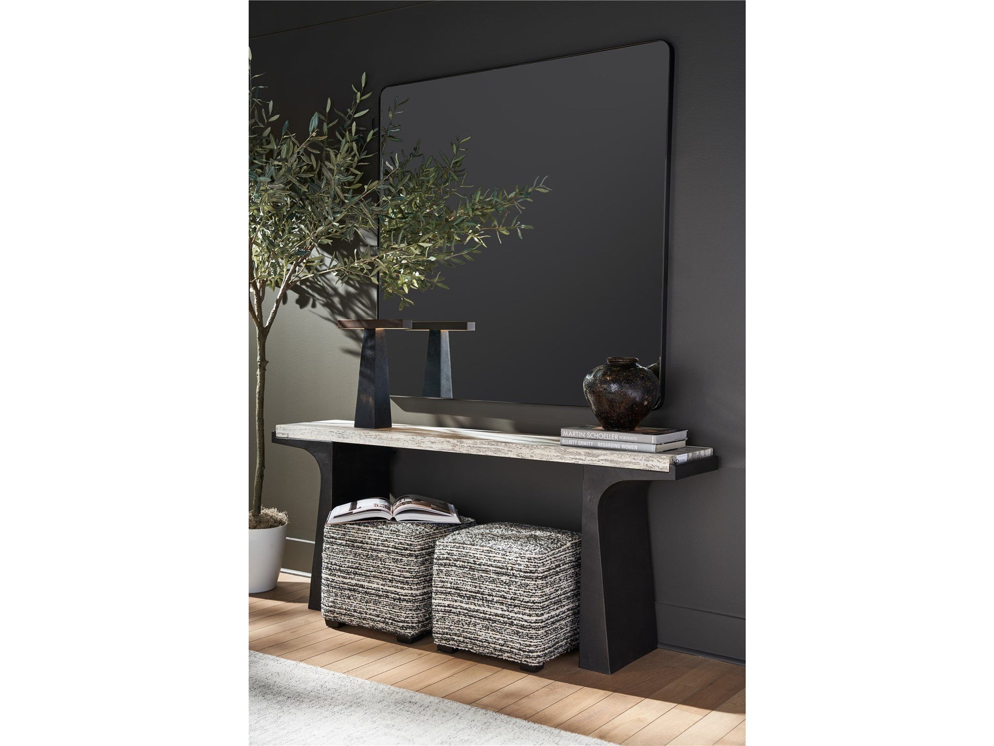 La consola Quill presenta un diseño elegante y abstracto, con una superficie de travertino blanco que descansa sobre un pedestal de aluminio con acabado en bronce oscuro. Esta pieza aporta un toque de textura mate y un aire de misterio, realzando los espacios con su estética única y su presencia refinada.
