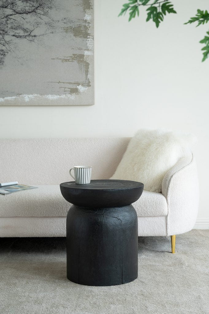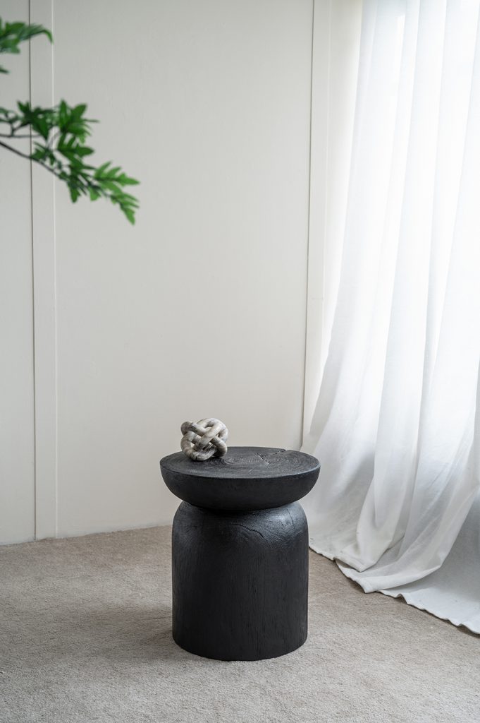 Con su silueta redonda y escultural, detalles de vetas orgánicas y un moderno tono negro mate, esta mesa decorativa de madera de suar combina durabilidad con un estilo rústico. Su versatilidad la hace ideal como mesita de noche, como mesa auxiliar en la sala de estar, como elemento decorativo en la entrada o como macetero.