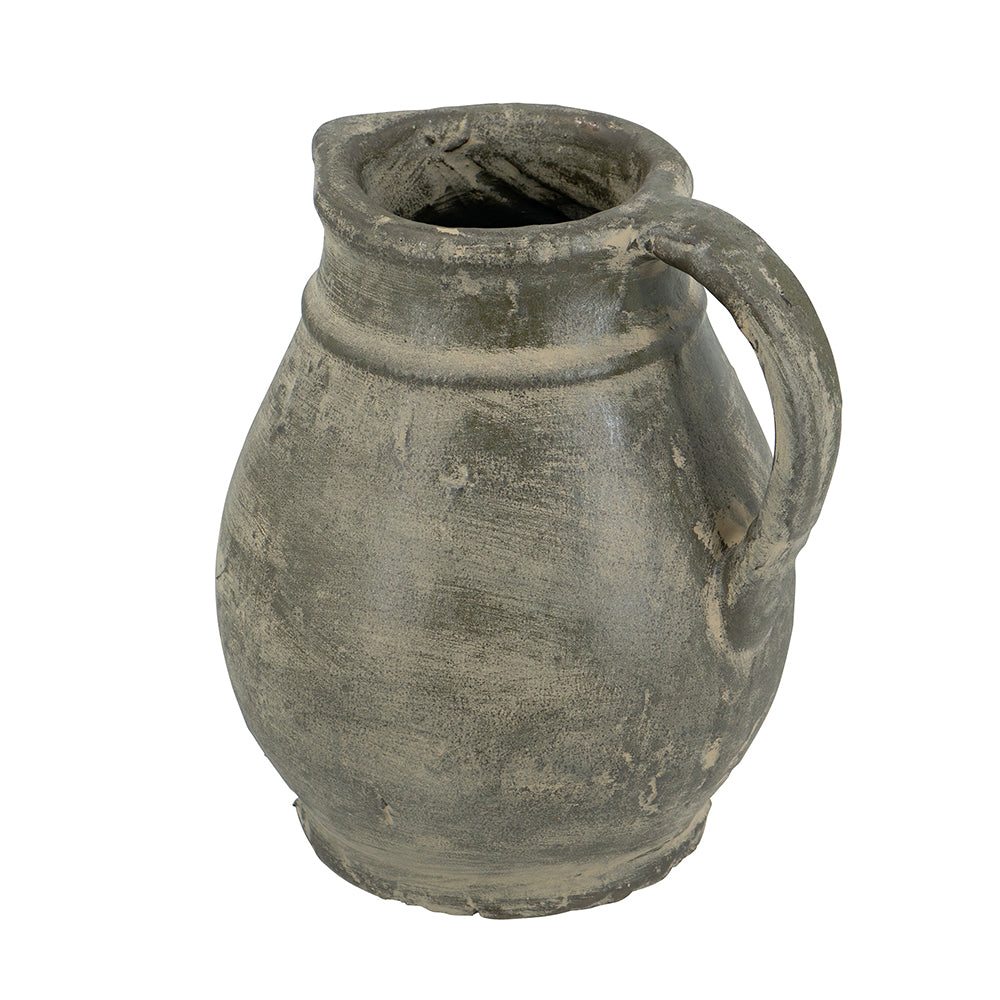 Inspirado en la refinada belleza de la cerámica europea vintage, este jarrón presenta la clásica silueta de una jarra, un acabado verde envejecido y un asa elegantemente curvada. Ya sea vacío o con un ramo de flores, sin duda atraerá la atención desde cualquier mesa, repisa, cómoda o aparador.