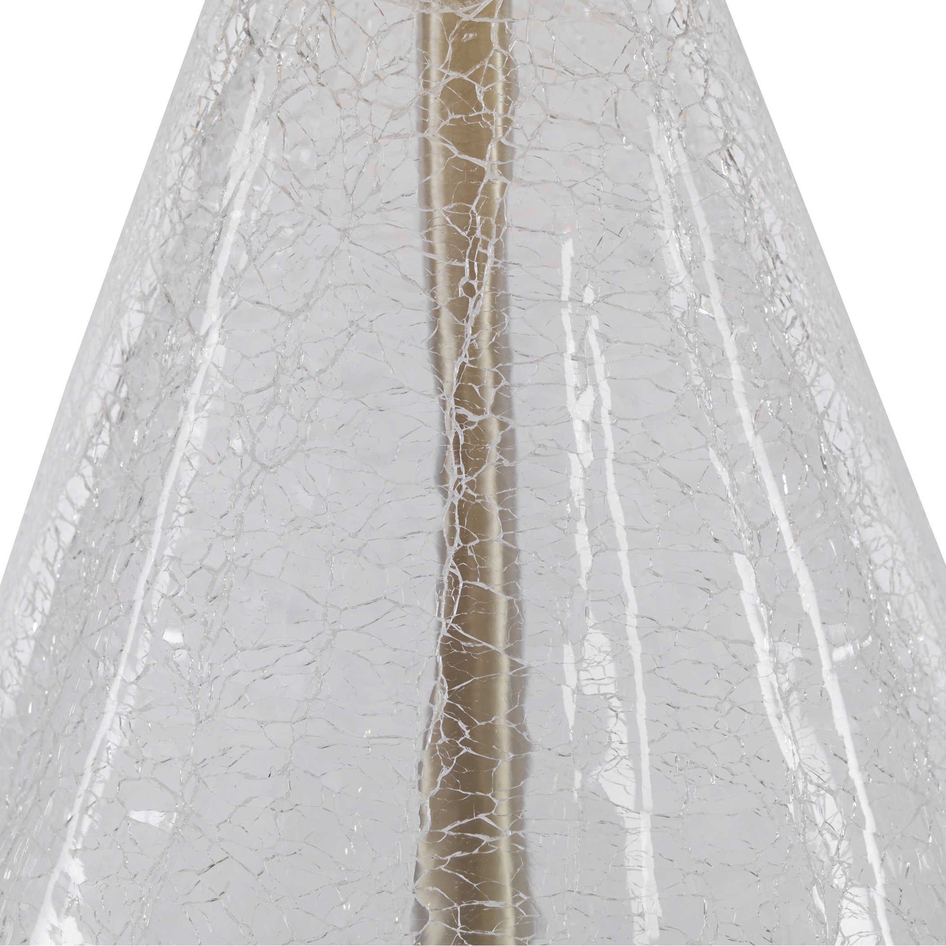 Base de vidrio agrietado transparente acentuada con detalles de latón cepillado chapado. El tono de espalda dura redonda cónica es un tejido de lino gris claro.