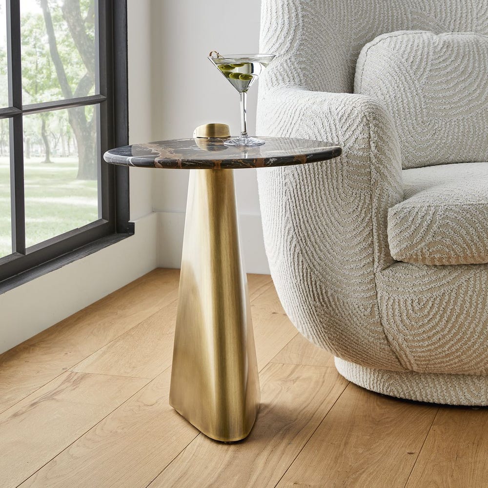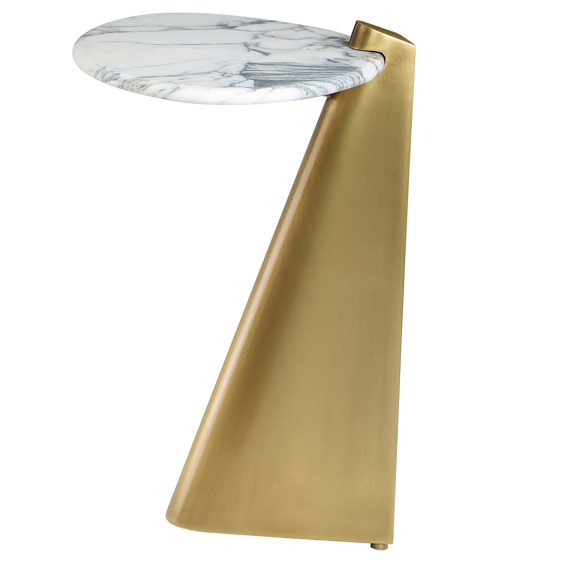 Una tapa de mármol en voladizo y una base de acero con acabado de latón antiguo dramáticamente inclinada transmiten movimiento y brindan una gran funcionalidad. Fiel a la naturaleza del mármol, cada pieza varía y garantiza que su mesa sea única.