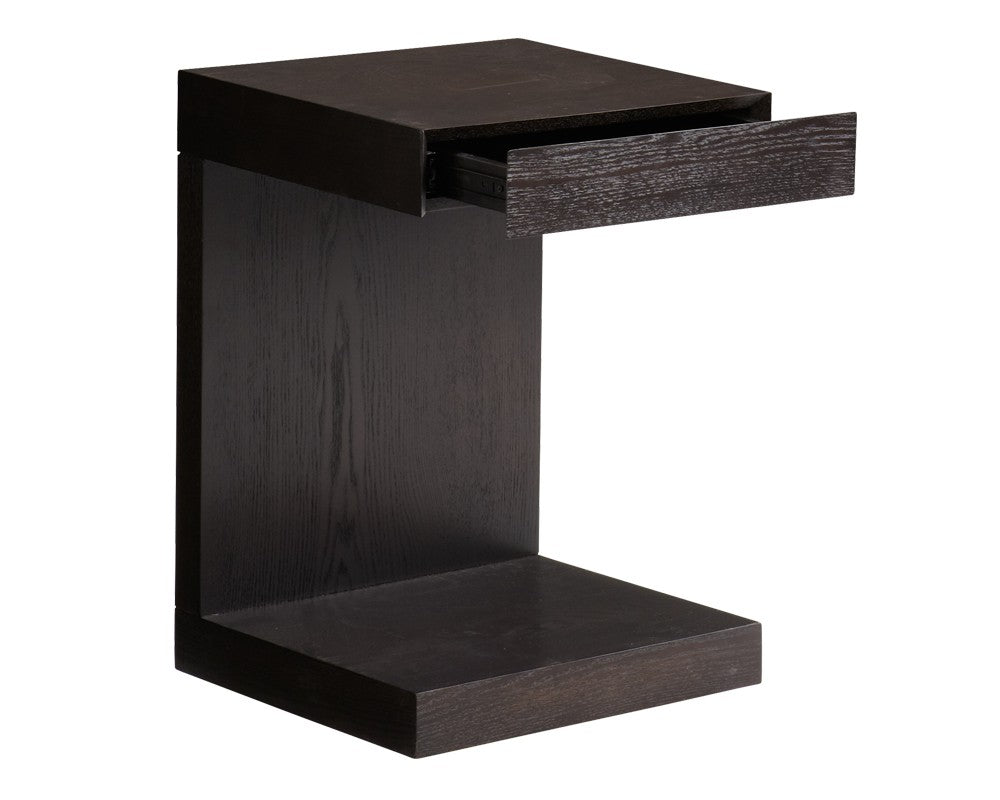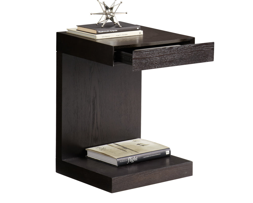 Esta sencilla pero muy funcional mesa en forma de C con cajón se puede usar con un sofá, una silla o incluso como mesita de noche. Disponible en blanco brillante. También disponible en espresso y madera flotante. Incluye ruedas.