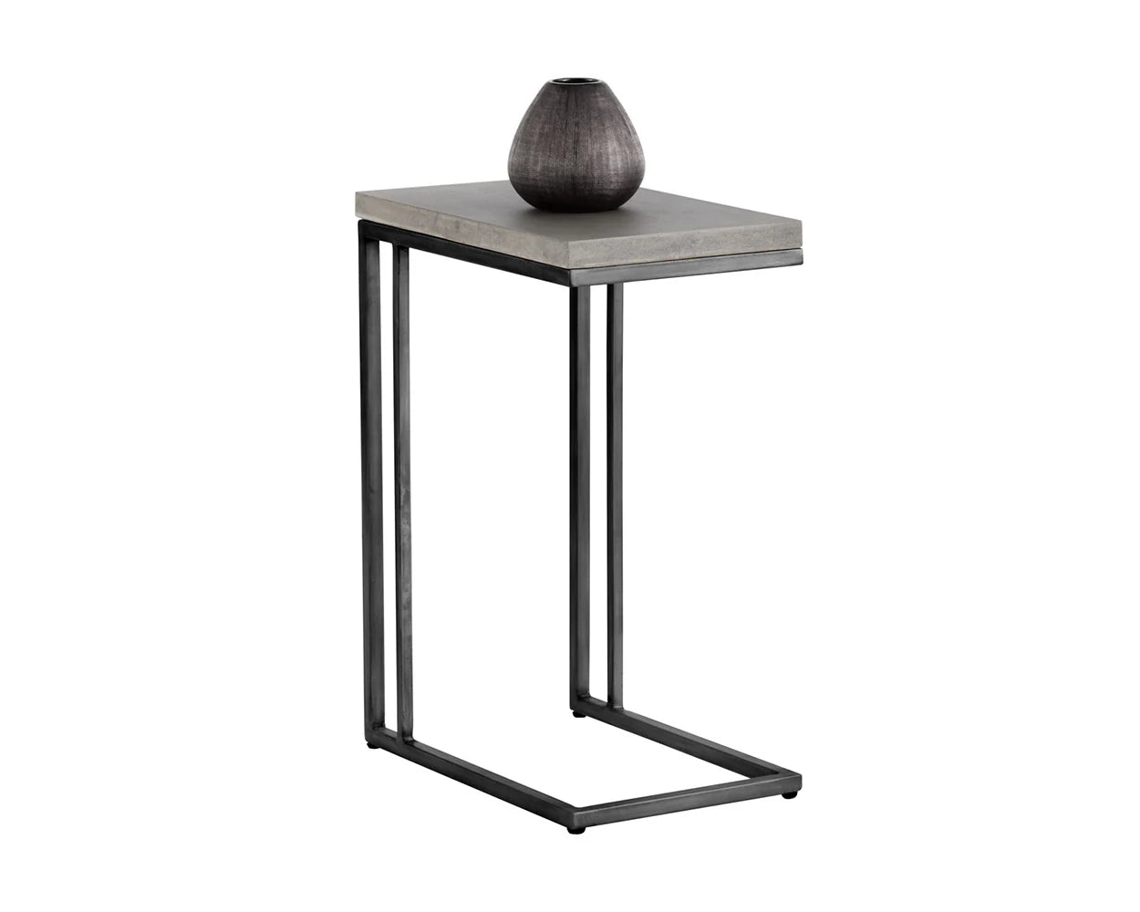 Esta mesa auxiliar minimalista en forma de C es una pieza decorativa elegante y práctica para espacios pequeños. Cuenta con un tablero de hormigón y una estructura de acero de latón antiguo, ideal para combinar con un sofá o una silla auxiliar.