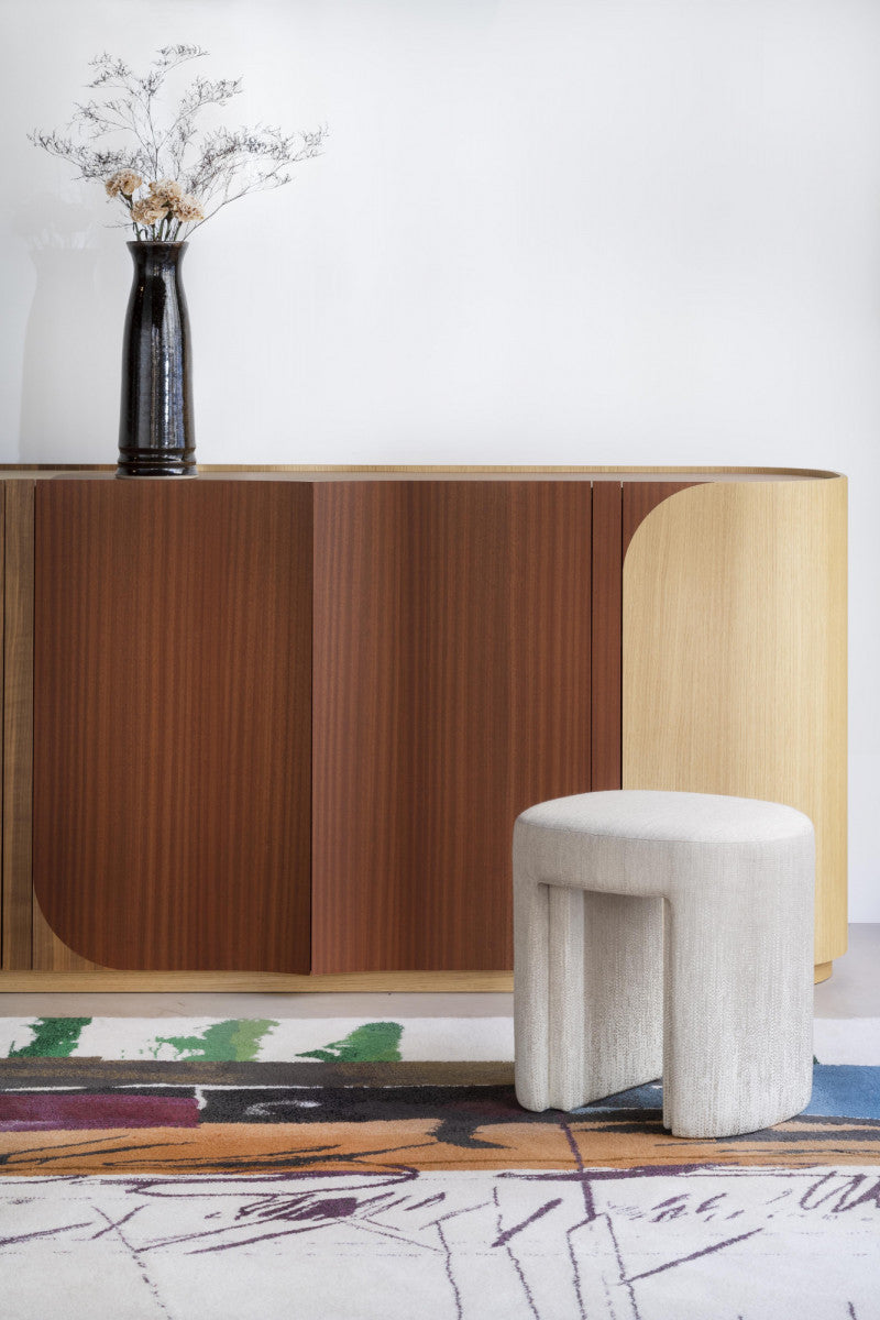 El rigor y la verticalidad del diseño se ven atenuados por la suavidad del revestimiento. Un arco modernista, un lado monumental que se invita al salón y le permite dialogar en belleza con nuestras piezas más sofisticadas.