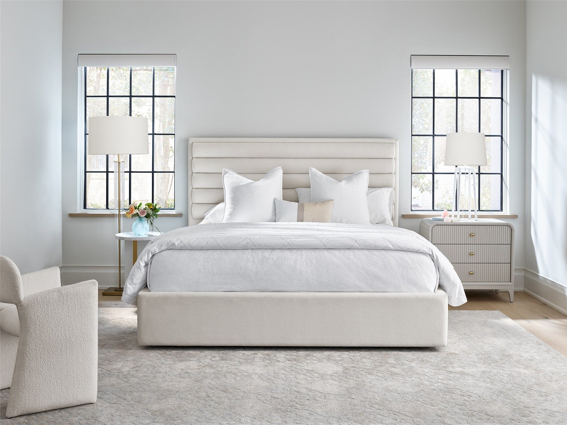 La cama tapizada Tranquility presenta una silueta suave y acogedora, con un respaldo de detalles tapizados enrollados enmarcados por una estructura de cama elegantemente discreta.