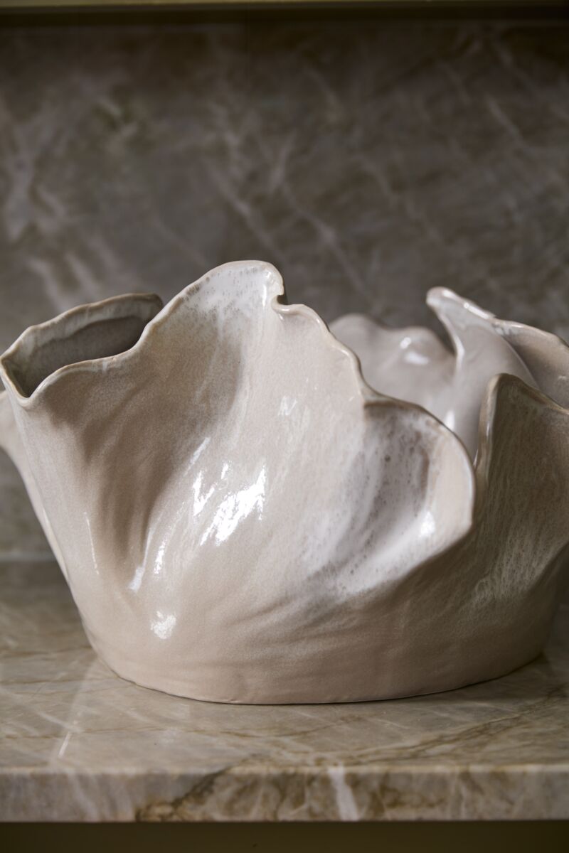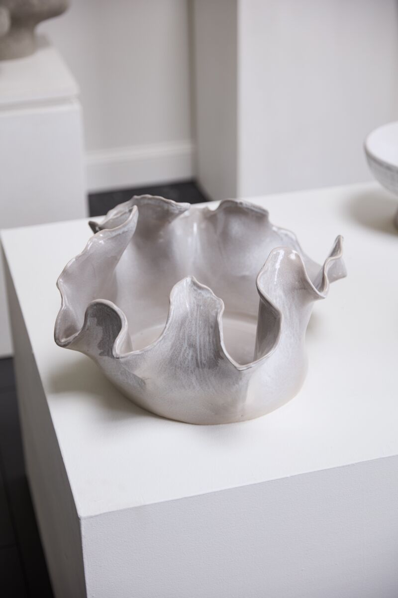 La artesanía se fusiona con la dimensión orgánica en el cuenco Waterfront de cerámica. Con una base circular, una abertura ondulada única y un borde con efecto de volantes que evoca el rompimiento de las olas del mar, este cuenco de gran tamaño se convierte en una pieza central destacada. Con su esmaltado reactivo y su tono gris blanquecino, este recipiente neutro combina con cualquier decoración.