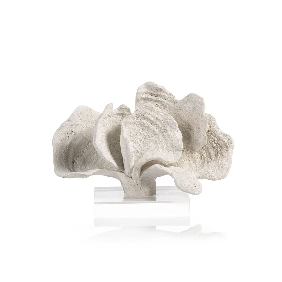 Escultura decorativa de aspecto orgánico que imita la forma de un coral o pétalos ondulados. Está hecha en un material de color blanco piedra, con textura rugosa que resalta su naturalidad y realismo. La pieza se sostiene sobre una base rectangular de acrílico transparente, lo que le da un toque moderno y elegante, permitiendo que la escultura sea el foco principal. Es ideal como objeto decorativo en mesas, estanterías o consolas, aportando un aire sofisticado y natural al espacio.
